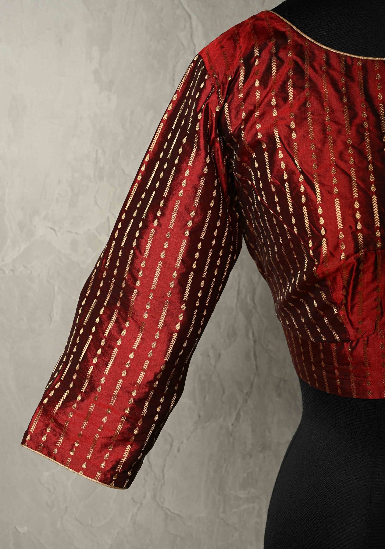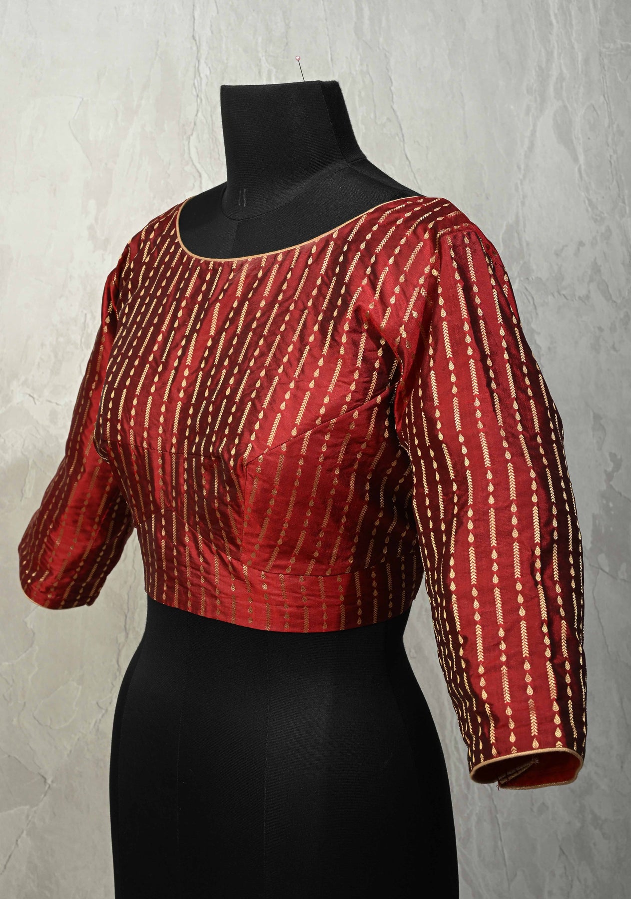This maroon pure silk blouse exudes timeless elegance with its classic boat neckline and quarter sleeves. Featuring intricately woven zari-ornated stripes, the blouse combines traditional craftsmanship with a sophisticated design. The lustrous silk fabric enhances the rich maroon hue, making it an ideal choice for weddings, festive occasions, and refined ethnic ensembles.