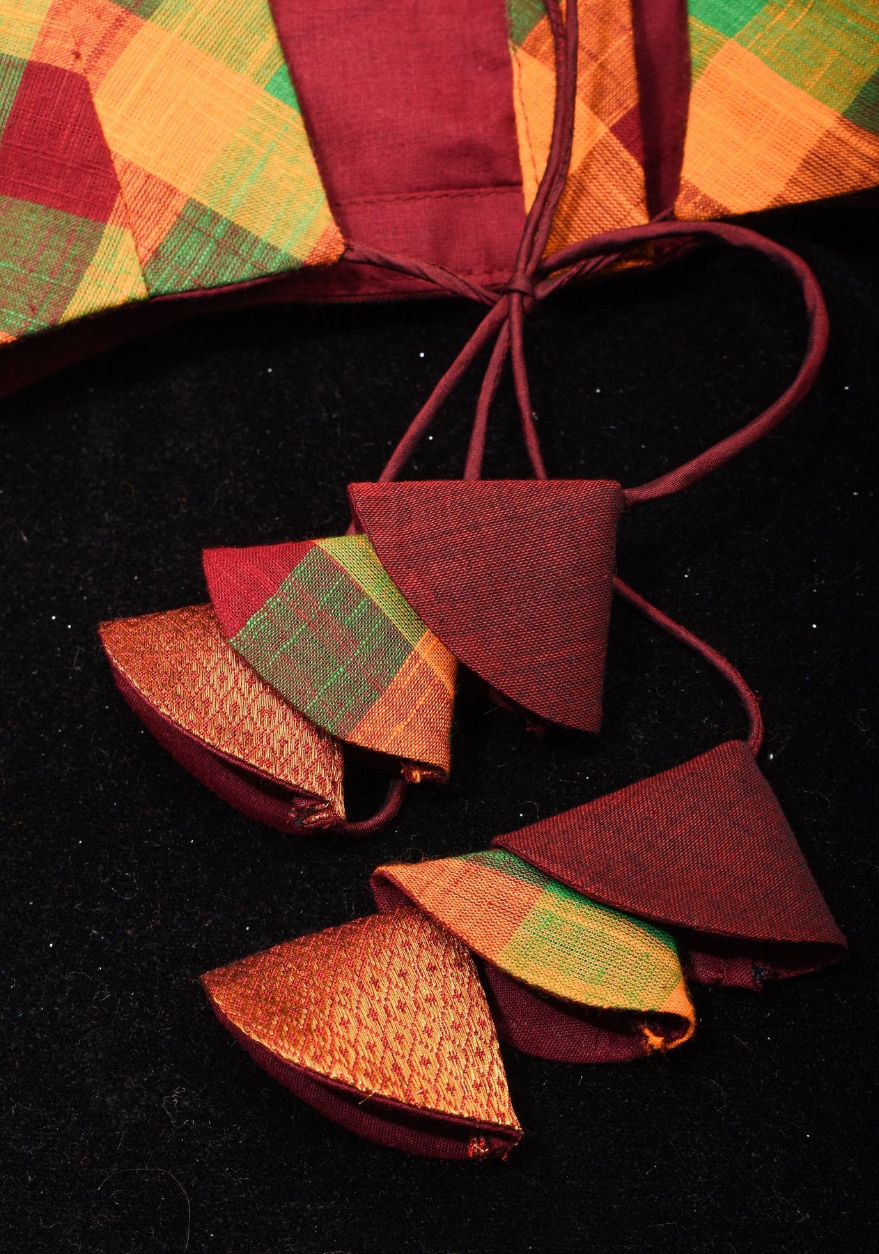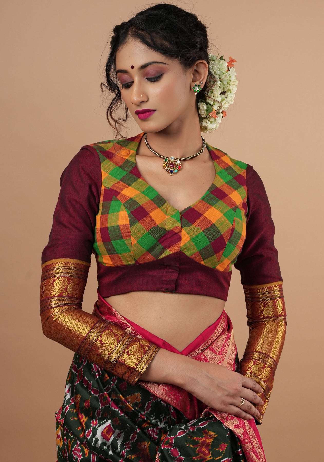 Madras Cotton checks goblet neck blouse with zari sleeves and tie back