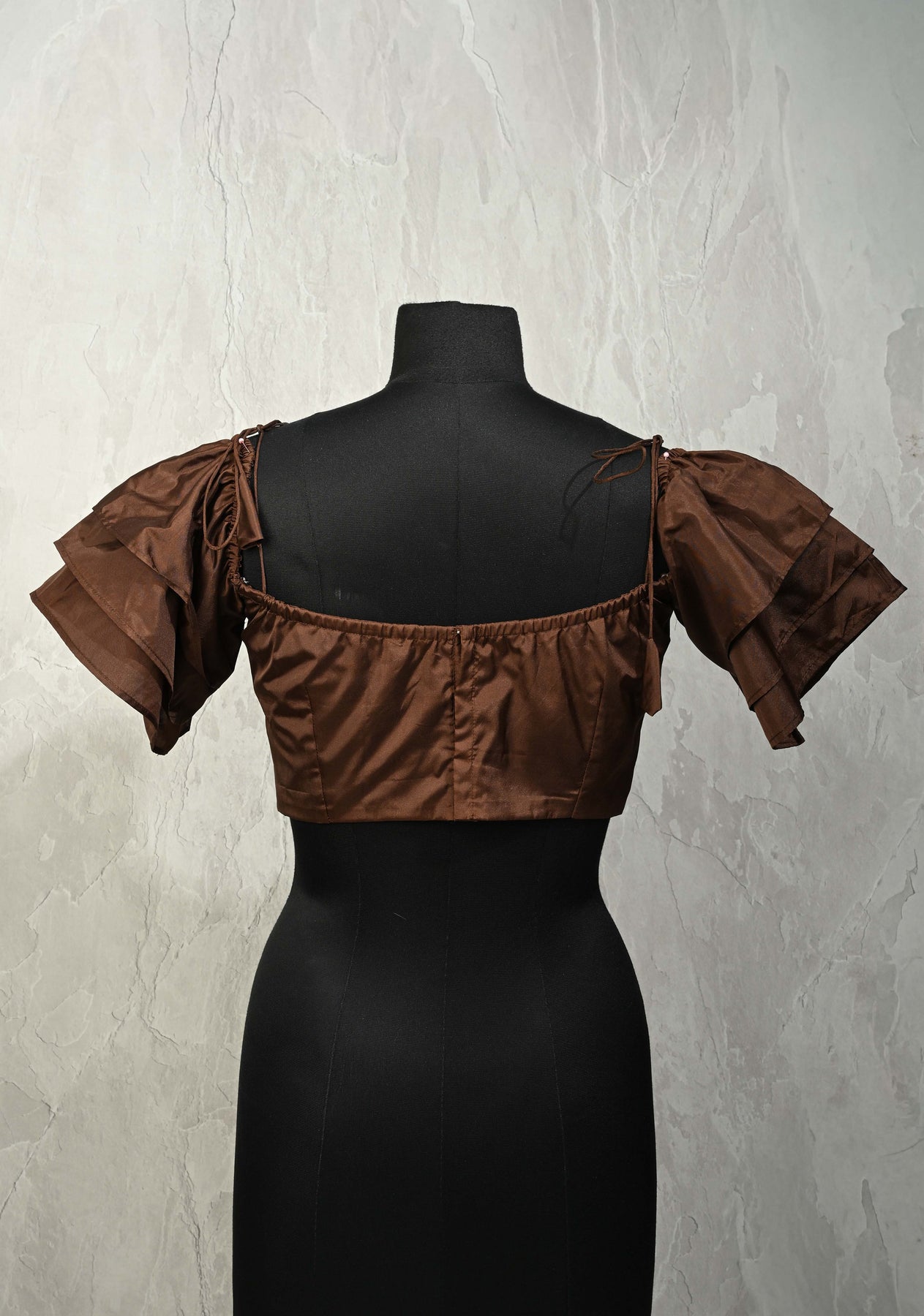 This brown sweetheart neckline crop top blouse blends elegance with contemporary charm. Designed with a flattering fitted silhouette, it features soft tiered ruffle sleeves that add volume and movement, while delicate shoulder ties lend a playful yet feminine touch. Perfect for pairing with sarees, lehengas, or skirts, this blouse is an ideal choice for festive occasions, brunches, and stylish daytime or evening looks.
