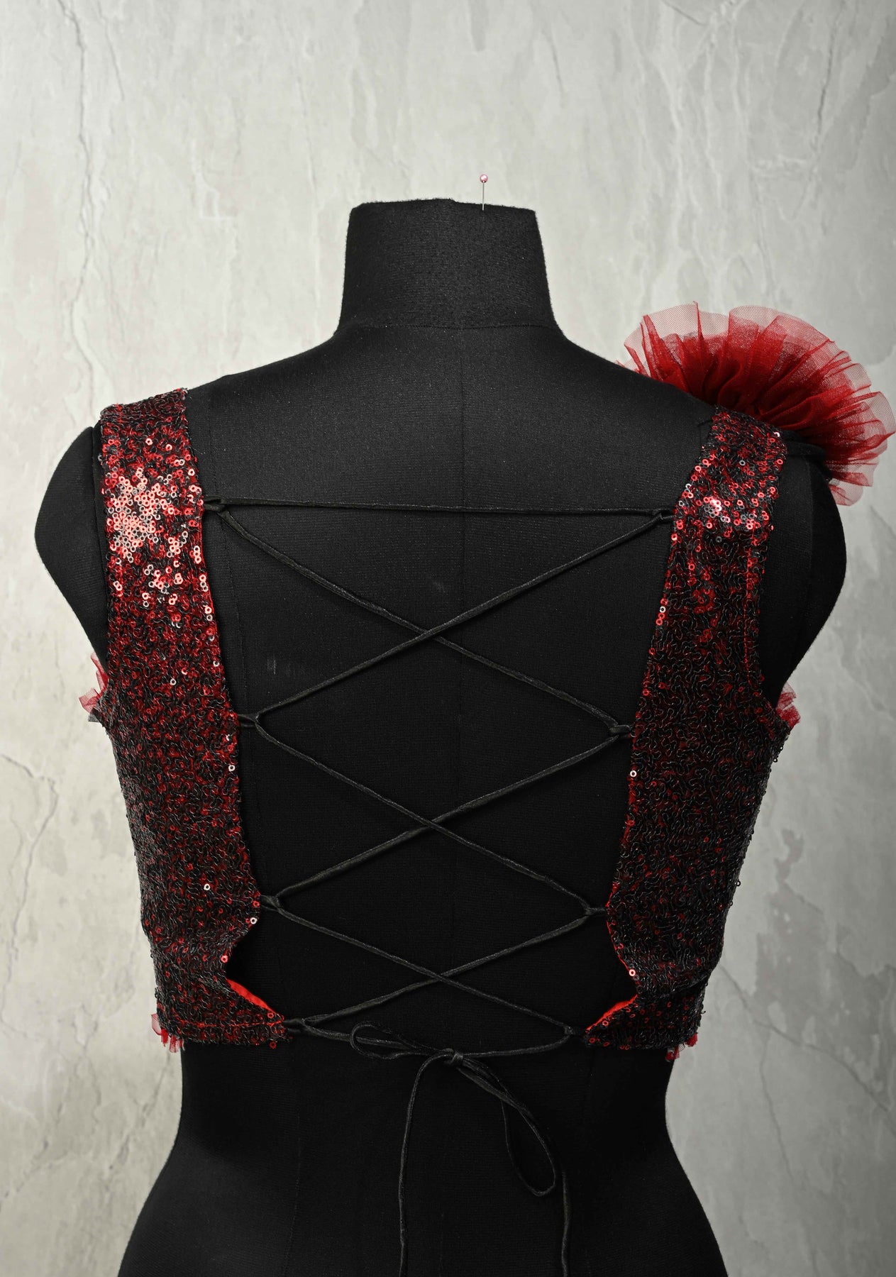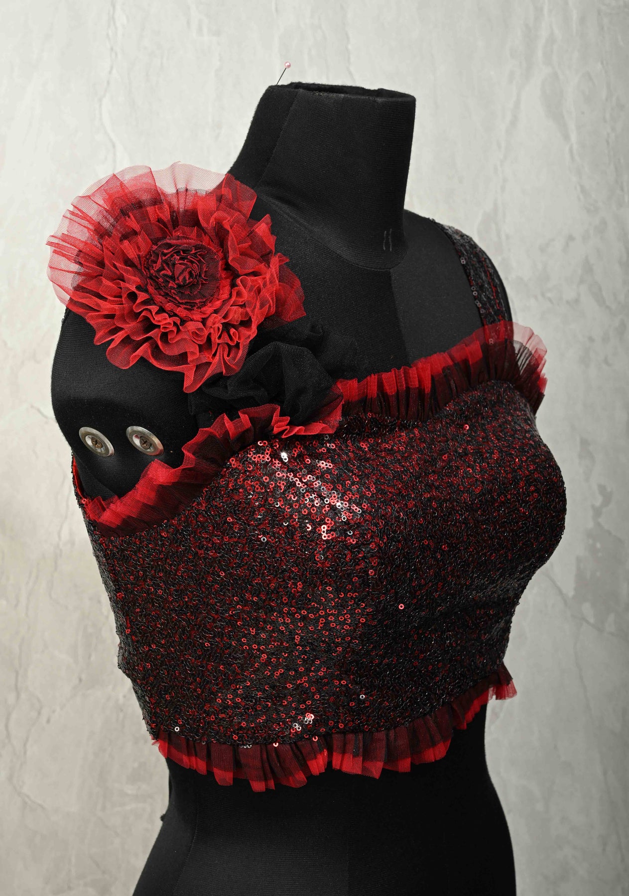 Make a bold style statement with this red and black sequin corset strappy crop top blouse, designed to turn heads. Featuring shimmering sequin detailing, the structured corset silhouette enhances the fit while delicate shoulder straps add a modern touch. The highlight of the design is the dramatic ruffled 3D flower detail that adds depth and femininity, complemented by a lace-up back for an adjustable, flattering fit. Perfect for pairing with sarees, lehengas, or skirts for festive occasions, parties, and contemporary ethnic looks.