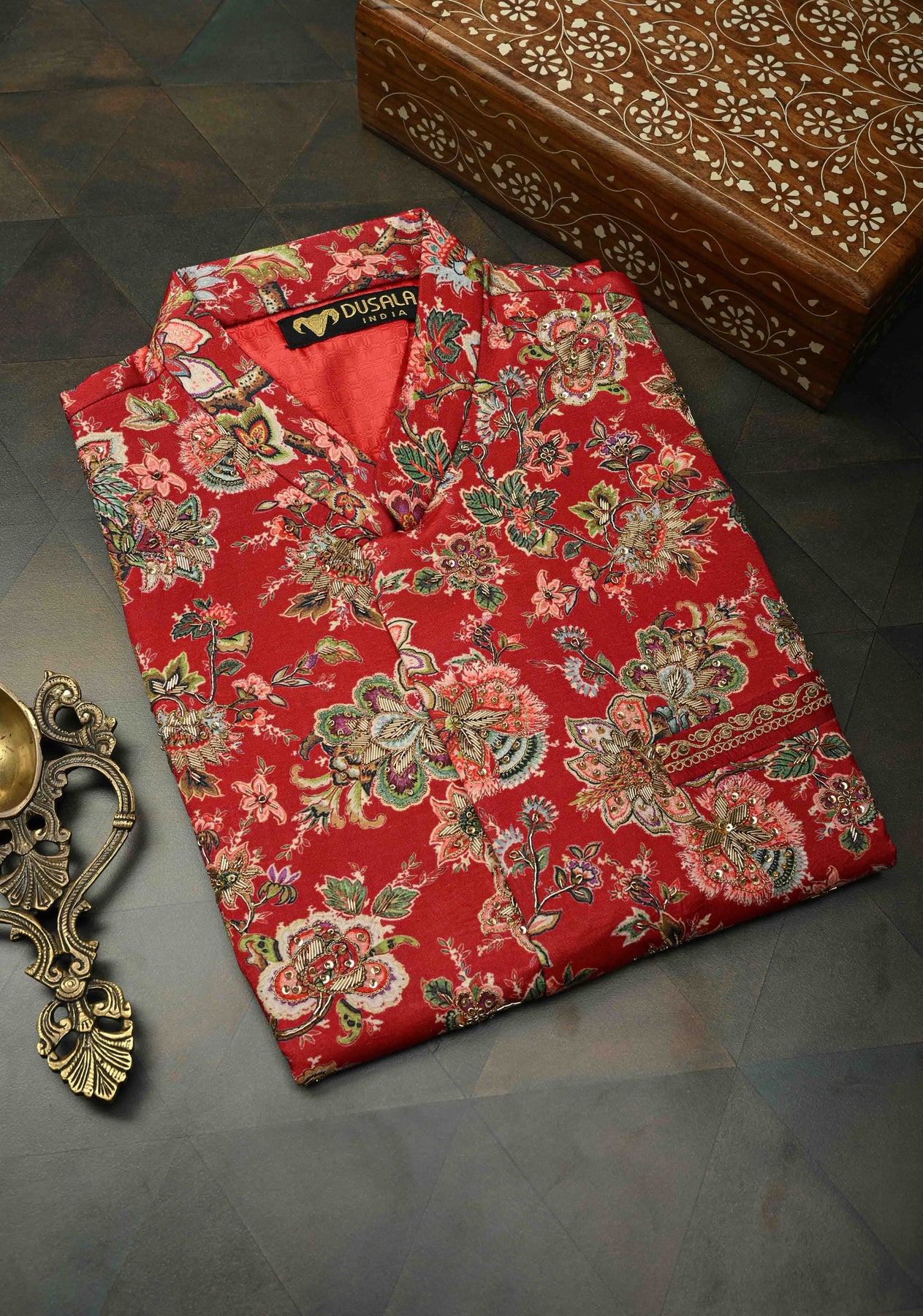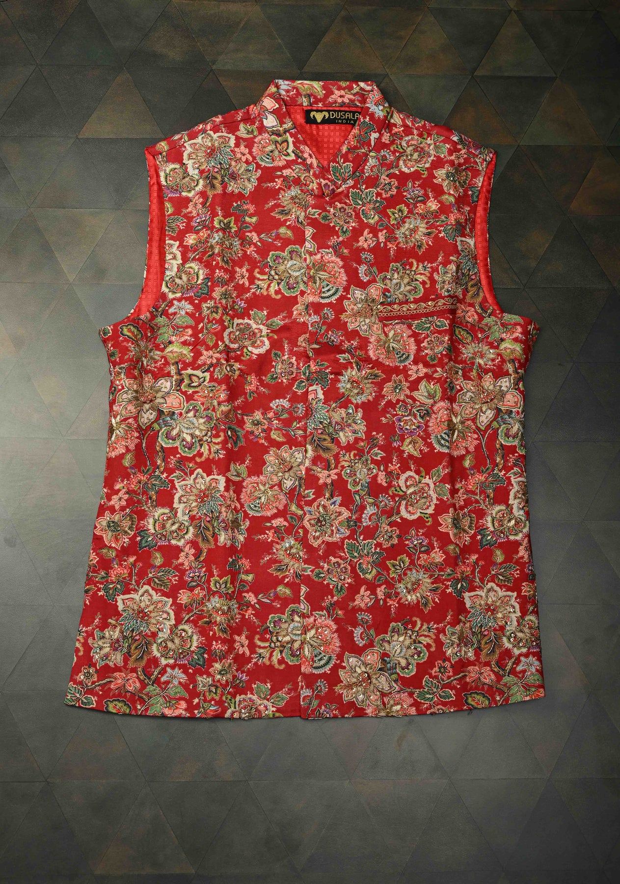 This Red Floral Digital Print Bandhgala Silk Waistcoat for Men is a statement piece that effortlessly blends traditional craftsmanship with modern elegance. The silk fabric is adorned with red floral digital prints, creating a bold yet refined aesthetic. Intricate Zardozi and sequins embroidery along the neckline and front panels add a touch of opulence, making this waistcoat perfect for weddings, receptions, or any formal event. Its tailored fit and full waistcoat design enhance the sophisticated look, offering both comfort and style for the modern gentleman.