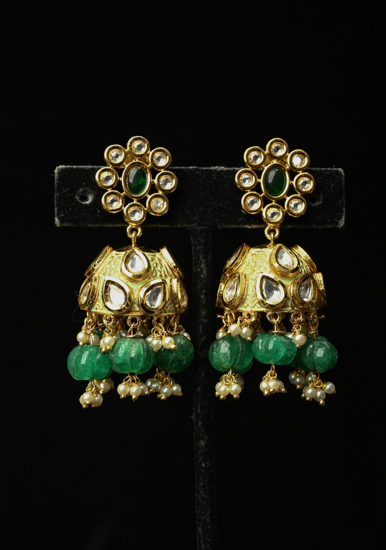 Kanika Green Kundan Meenakari Jhumki with pearls and Dangling Beads
