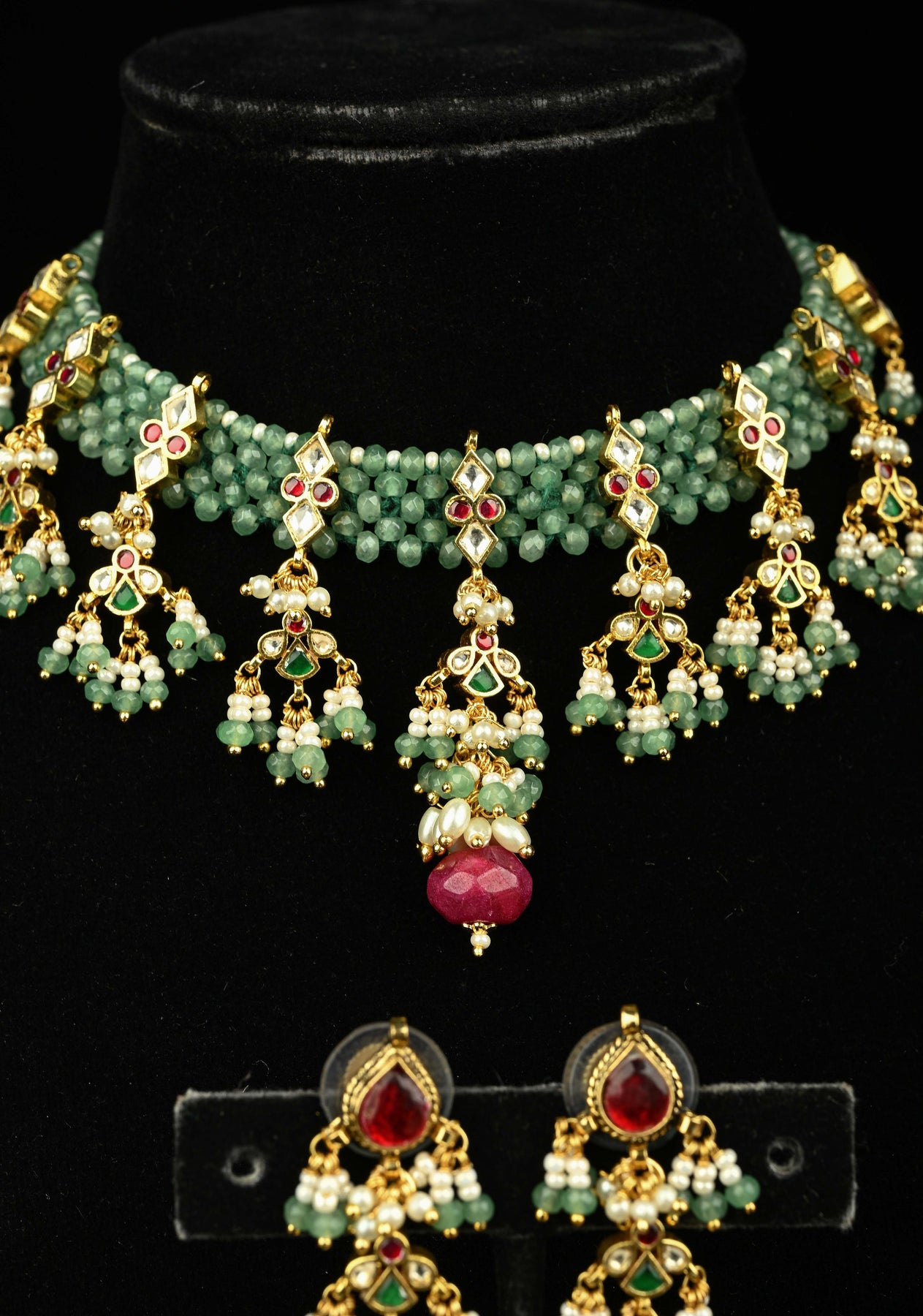 Multistrand Green Beaded Choker Necklace Set with Kundan Accents and Dangling Beads