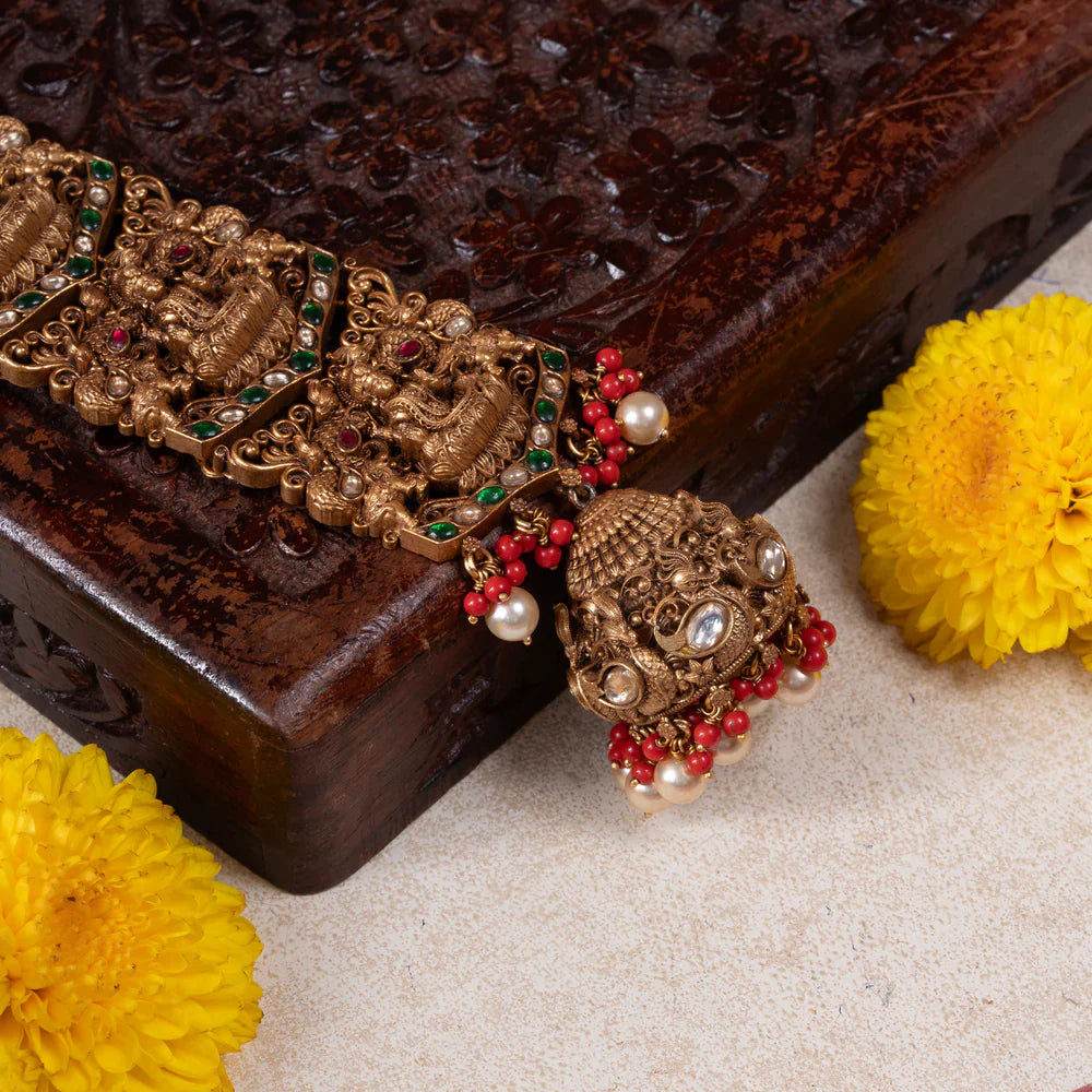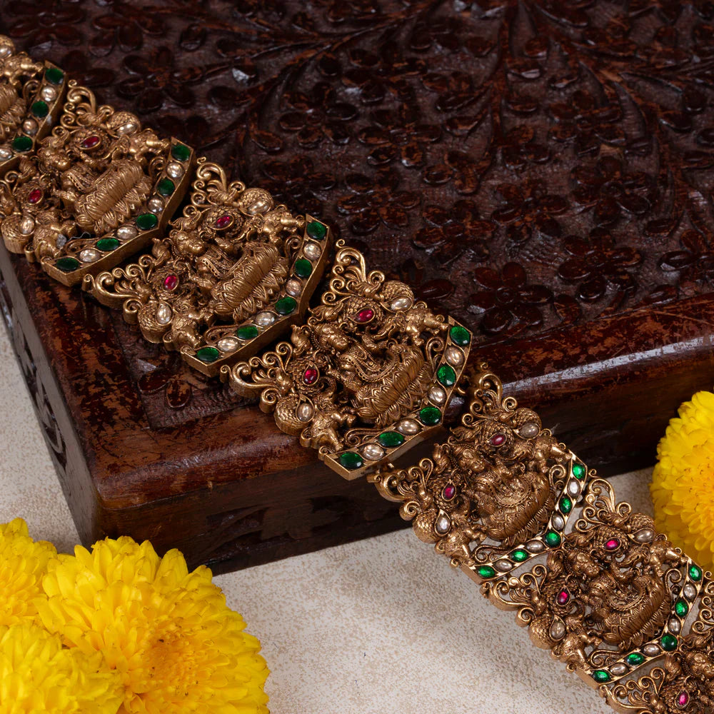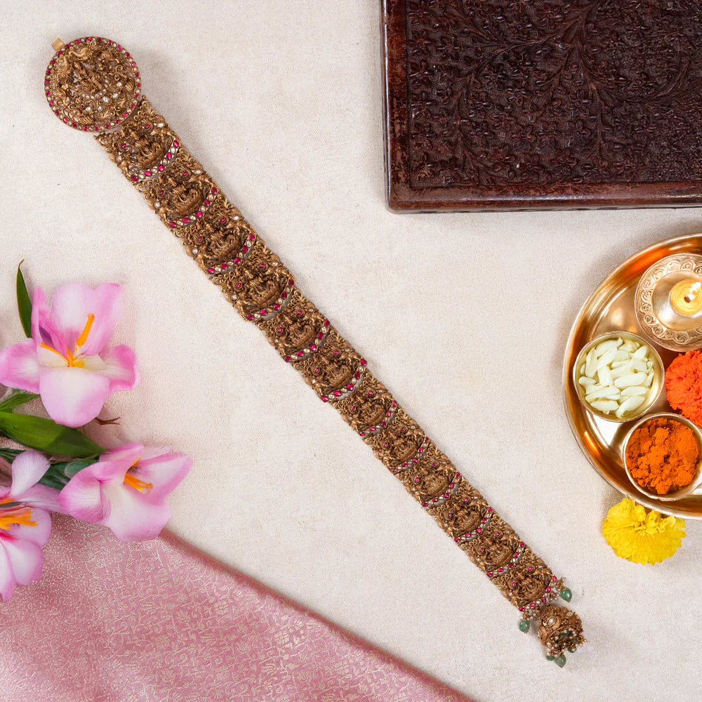 The Gajalakshmi Mayura Jada is an exquisite traditional hair accessory intricately designed with motifs of Lakshmi, Elephants, and Peacocks. Adorned with sparkling Kundan stones, it features elegant hangings of Pearls and Corals that add a refined touch. This piece combines cultural symbolism with artisanal craftsmanship, making it a distinguished choice for special occasions and bridal wear.