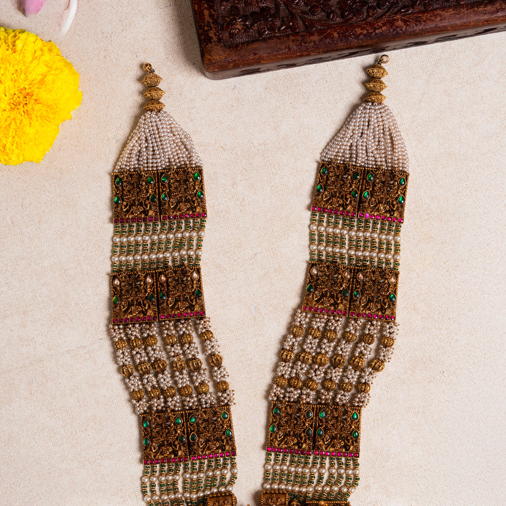 Celebrate divine love and tradition with this Krishna Raas Leela Haaram, featuring intricate depictions of Lord Krishna’s Raas Leela in a majestic design. Perfect for weddings, temple occasions, and festive celebrations—this statement piece radiates spiritual grace and timeless elegance