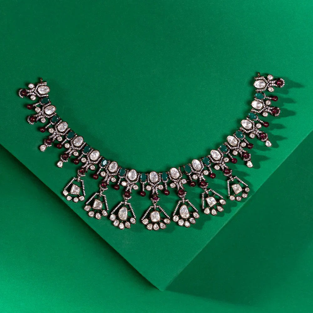 The Victorian Orchid Necklace showcases an exquisite design featuring elegant Oval and Floral motifs. Expertly crafted, it is adorned with sparkling Moissanite, brilliant Cubic Zirconia stones, vibrant Emeralds, and rich Rubies. This combination of gemstones enhances its vintage charm while offering exceptional brilliance and colour, making it a timeless statement piece for discerning collectors and connoisseurs of fine jewellery.
