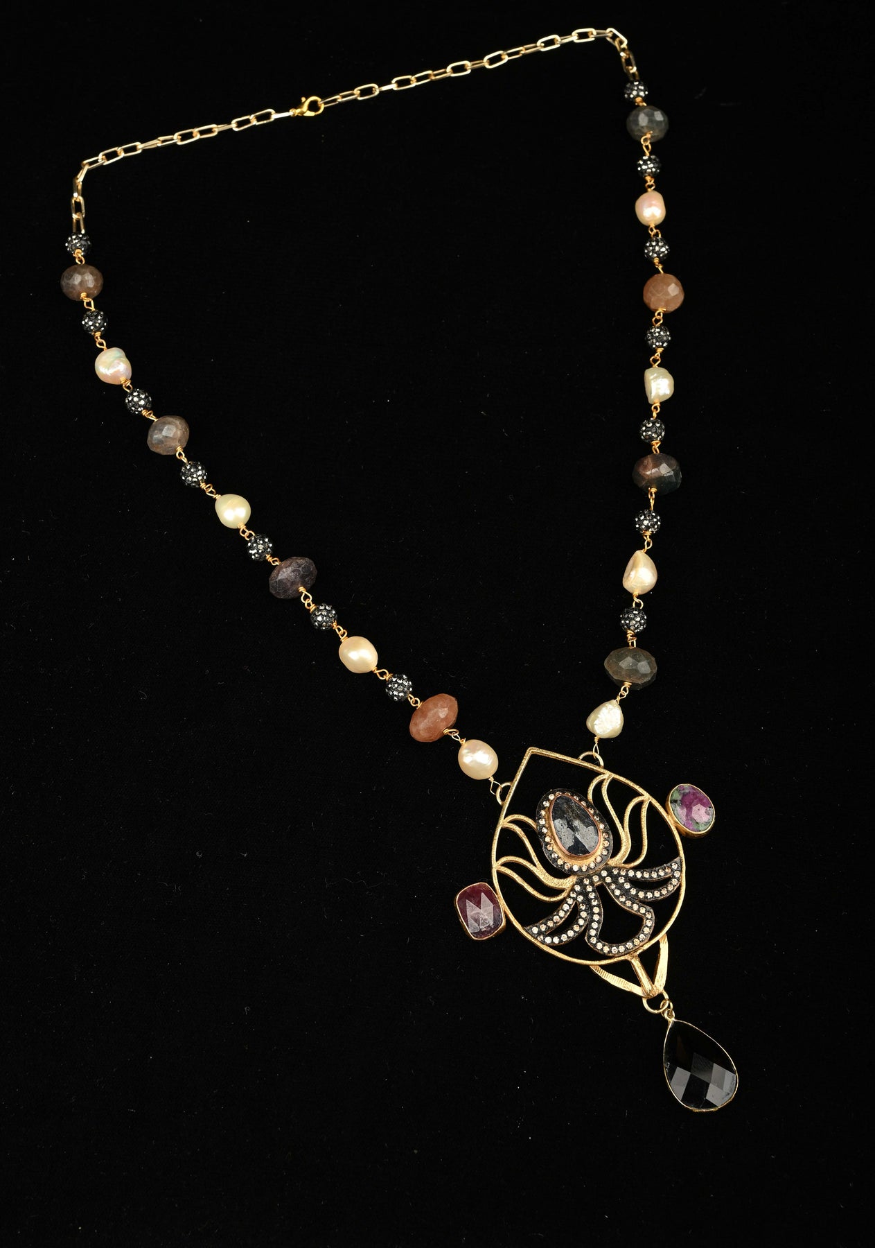 Sapphire and Pearls Long Necklace with Statement Pendant