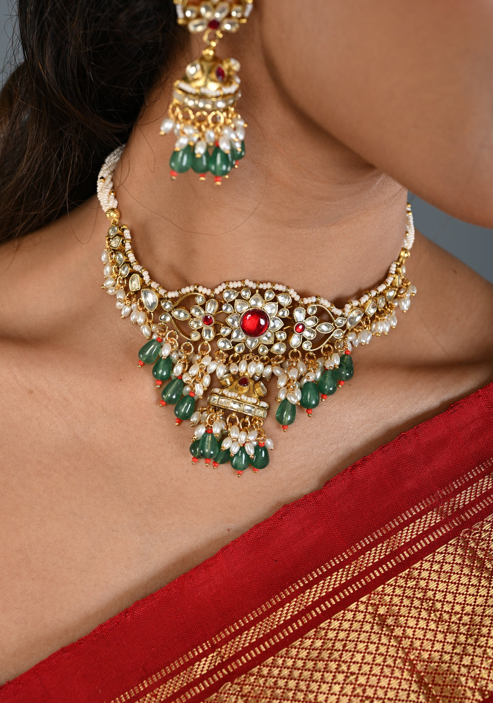 Ethnic Indian Choker Set with Red stone Embellishments and Beads Drops