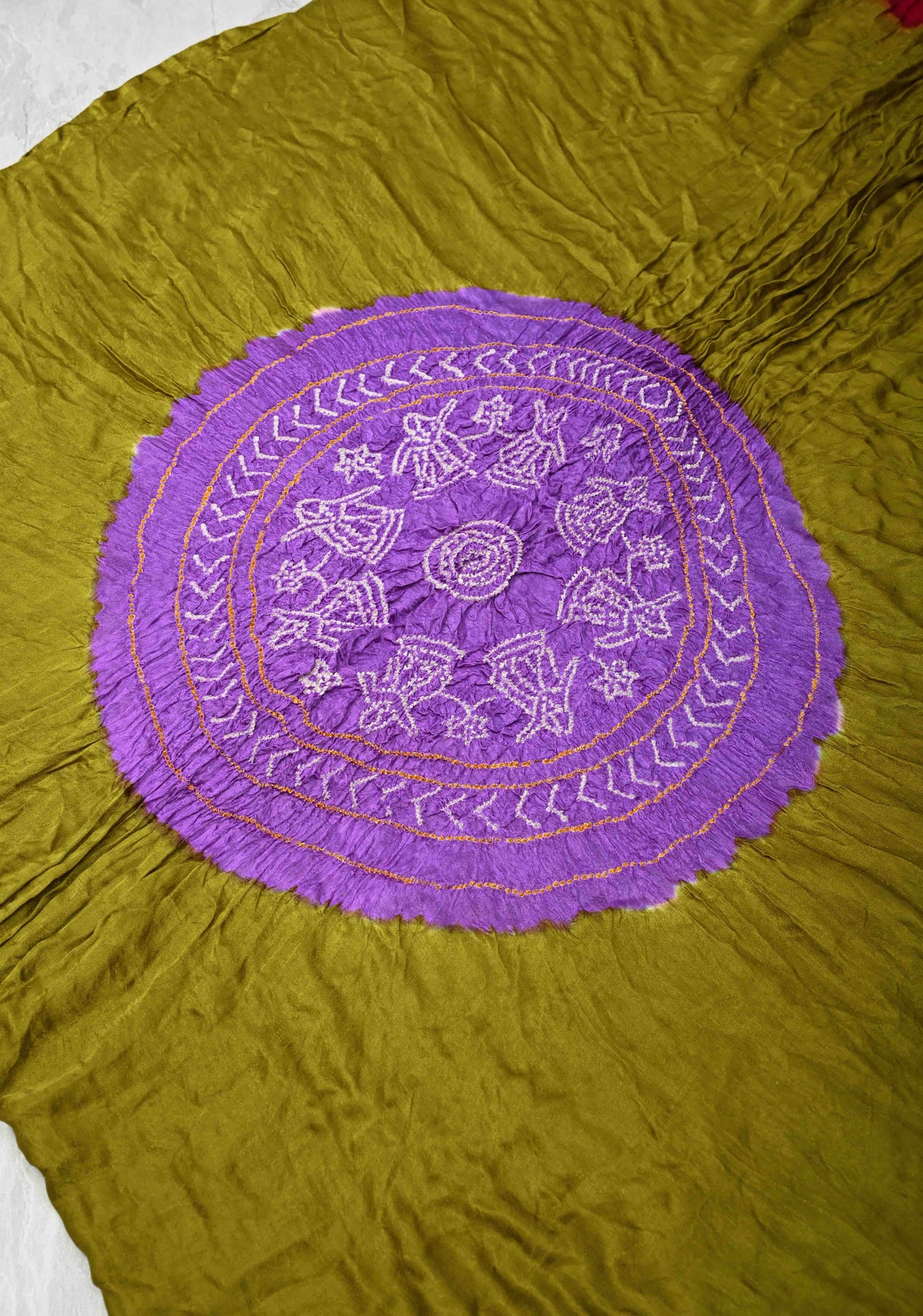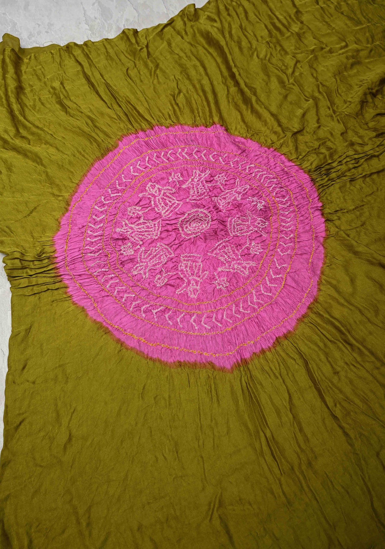 Hand Shibori mandala Dye and bandhej design in olive yellow on kaftan habutai silk Saree | SILK MARK CERTIFIED
