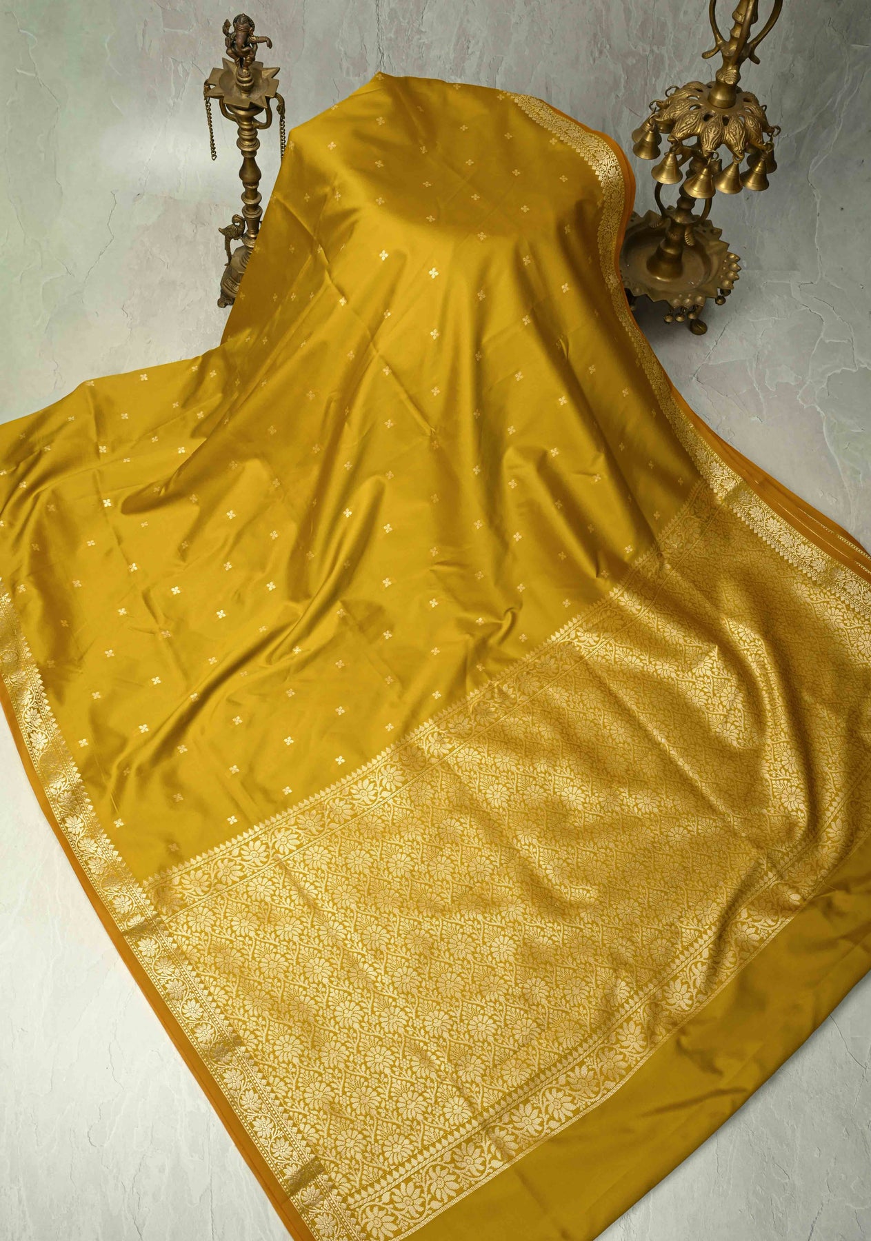 Mustard Yellow Semi Silk Saree with Chunri Buttis and Minimal Zari Border