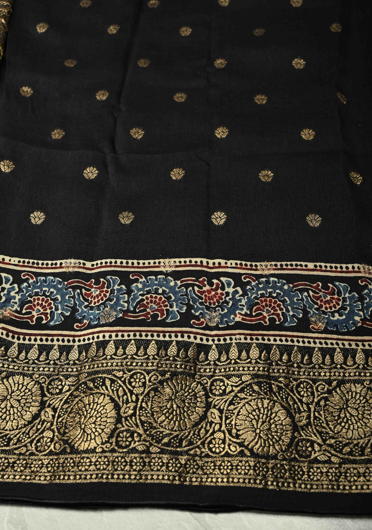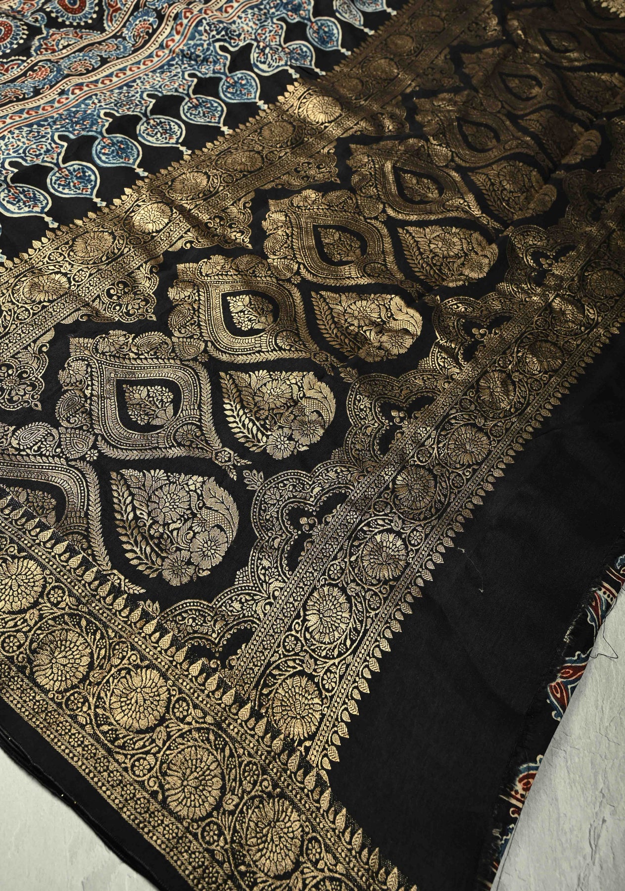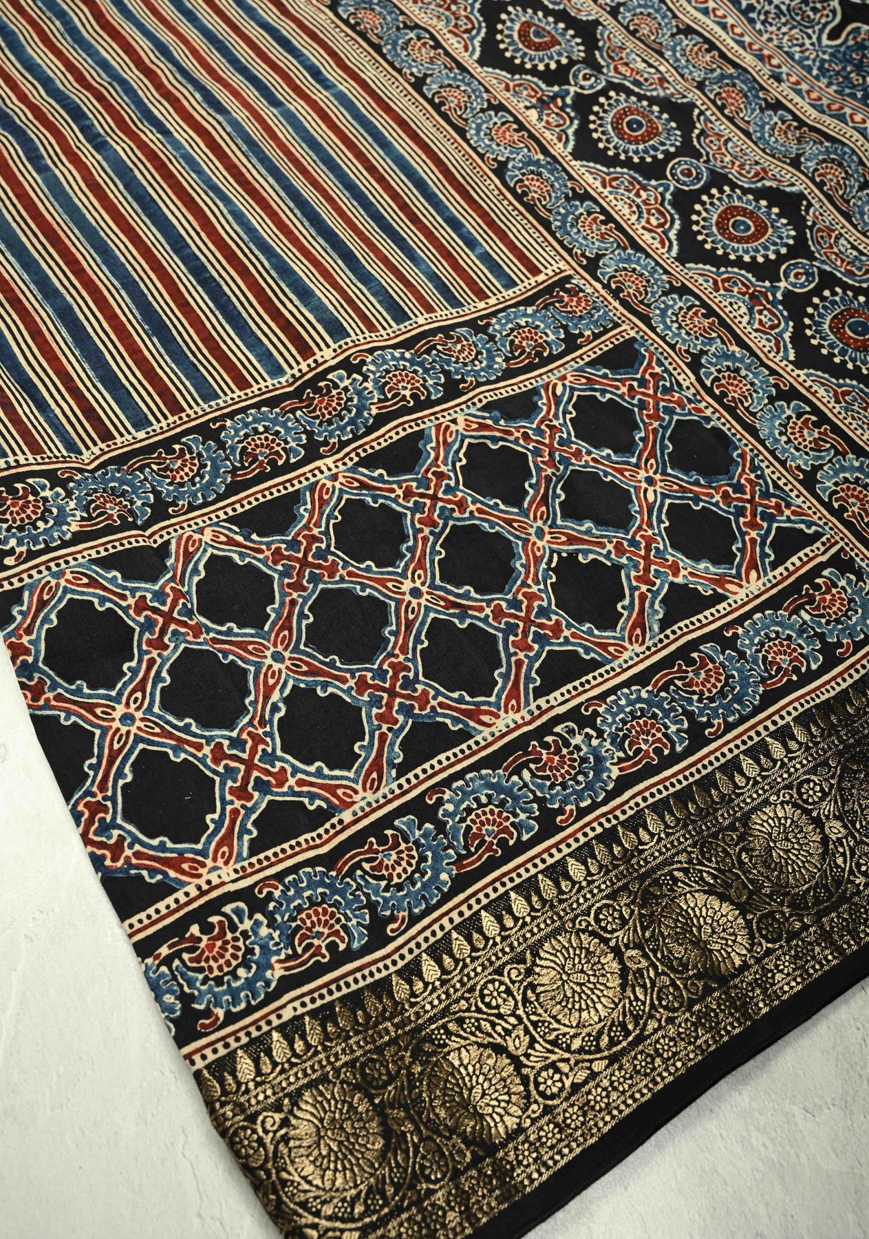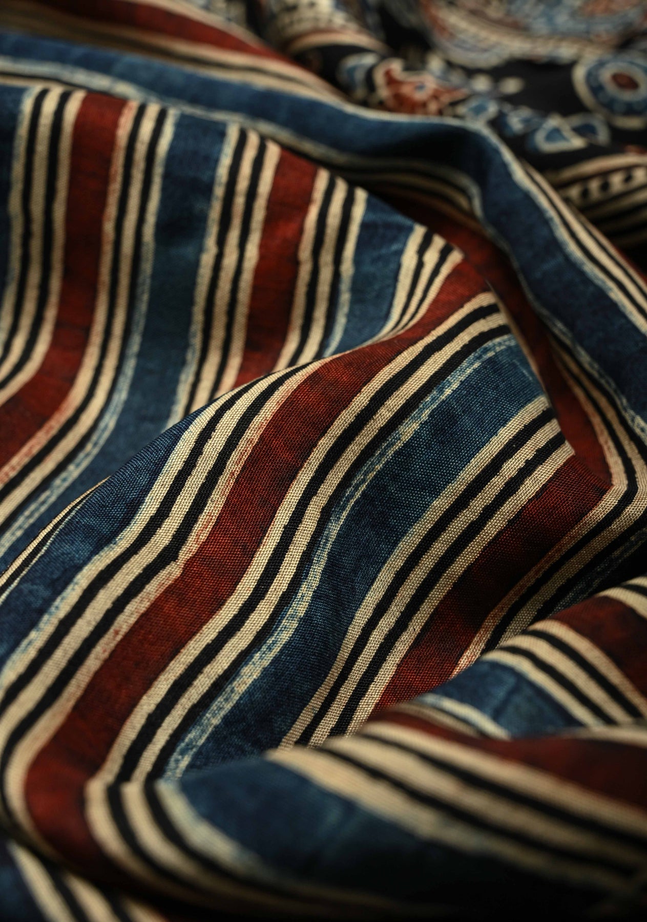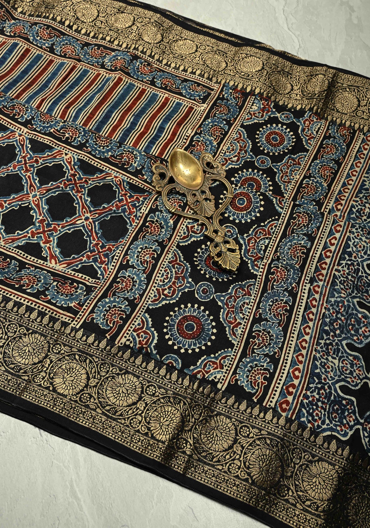 Make a statement with this Red-Blue-Black Modal Silk Saree, a perfect blend of contemporary style and traditional artistry. Crafted from soft, flowing modal silk, the saree features exquisite Ajrakh hand block prints across the body, reflecting the timeless charm of handcrafted Indian textiles.