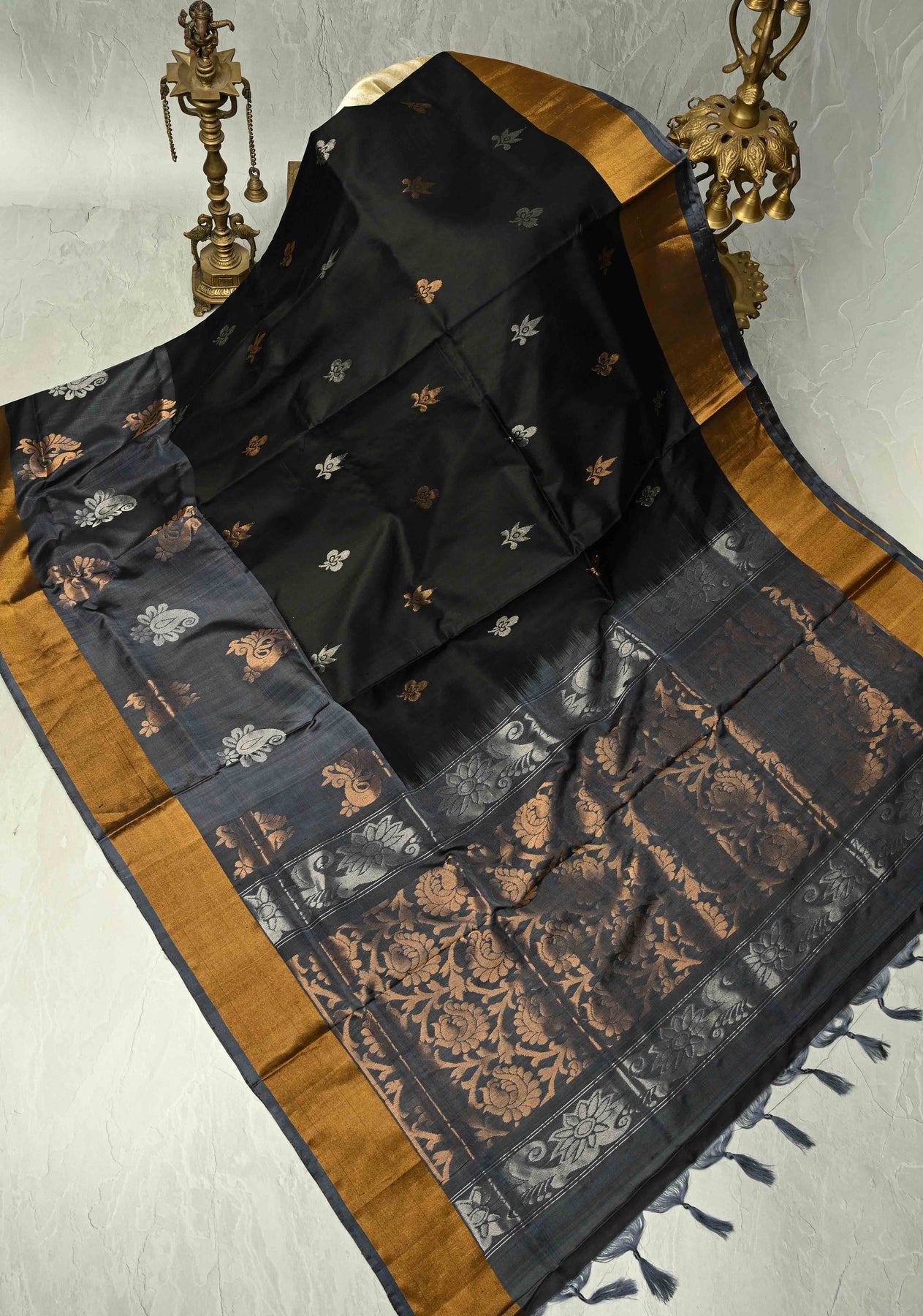 Make a bold statement with this Stunning Black Uppada Handloom Silk Saree, beautifully embellished with intricate gold and silver zari buttas that add a regal shimmer. Handwoven from Uppada silk, it drapes effortlessly with a soft, lustrous finish. The tissue border enhances its timeless grace, making it a perfect choice for festive occasions, and elegant evening events.