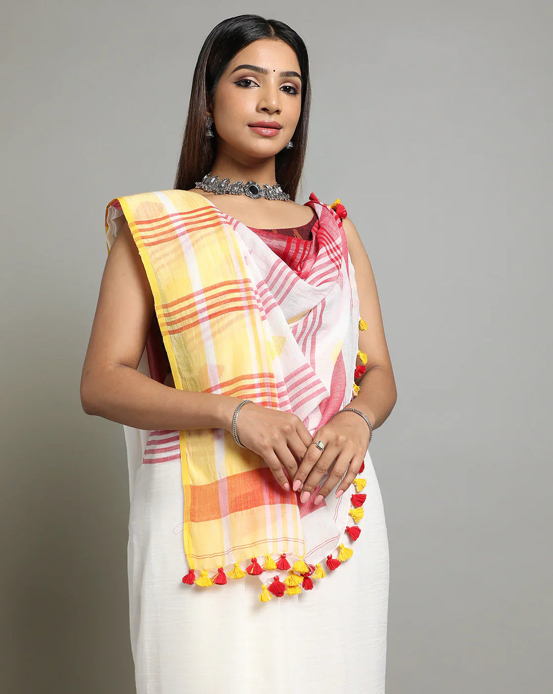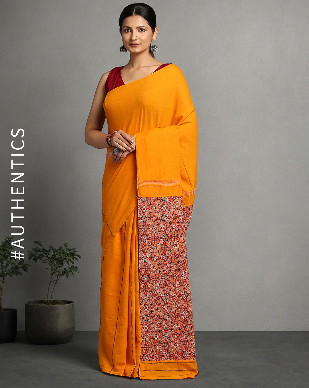 Orange 100% Cotton Handloom Saree Weave technique is khesh
