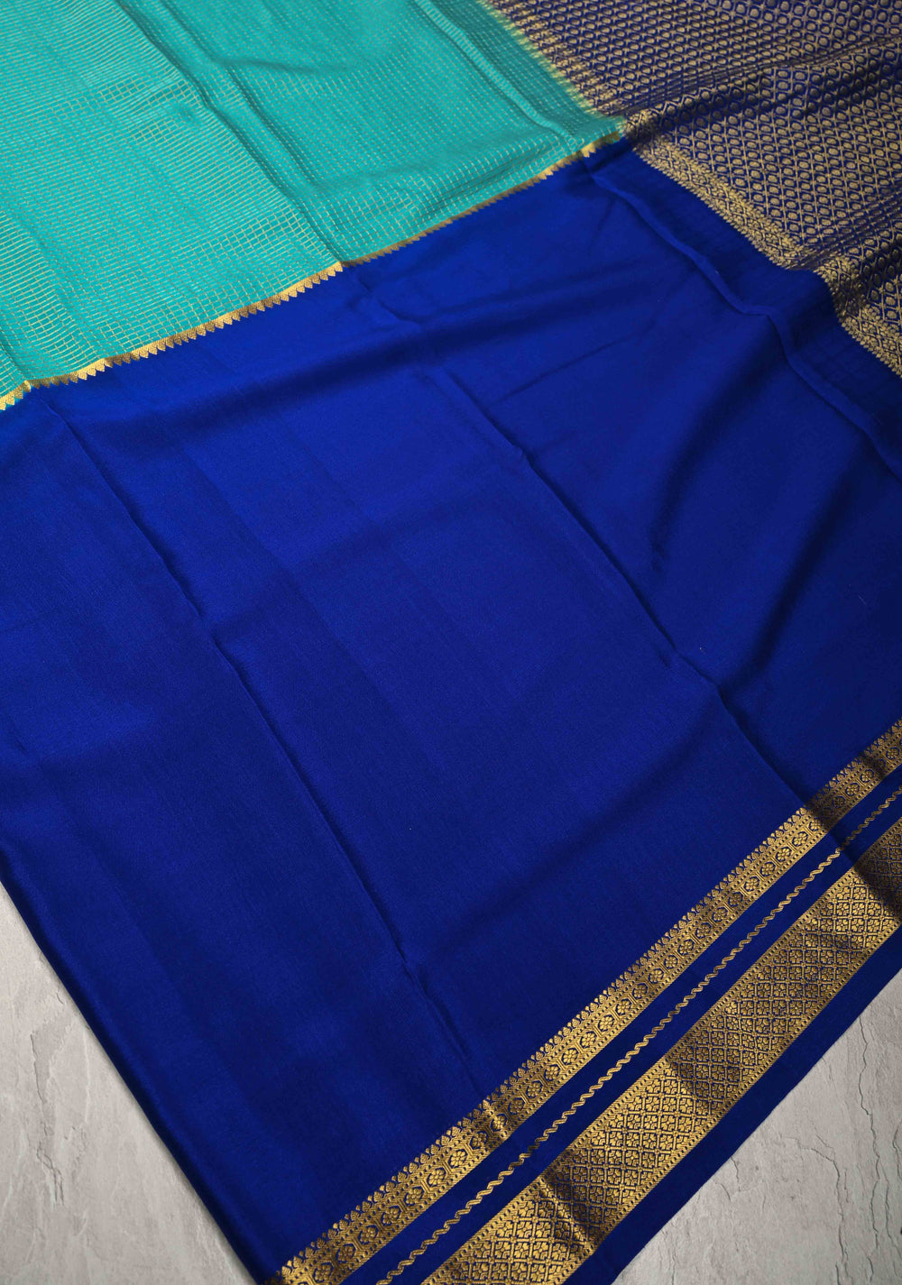 Royal Blue Pure Mysore Silk Saree with Podi-Kattam Zari Checks on Turquoise and Zari Border in KSIC Grade Thickness | SILK MARK CERTIFIED
