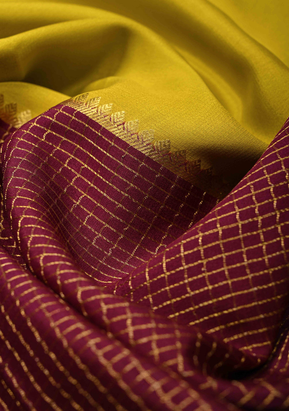 Moss Yellow Pure Mysore Silk Saree with Podi-Kattam Zari Checks on Plum and Zari Border in KSIC Grade Thickness | SILK MARK CERTIFIED