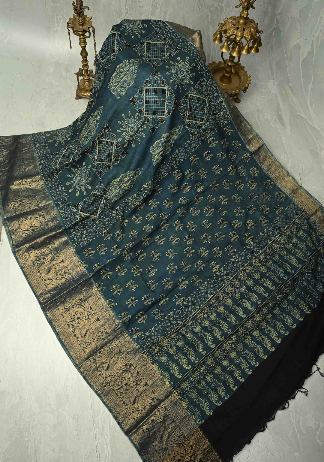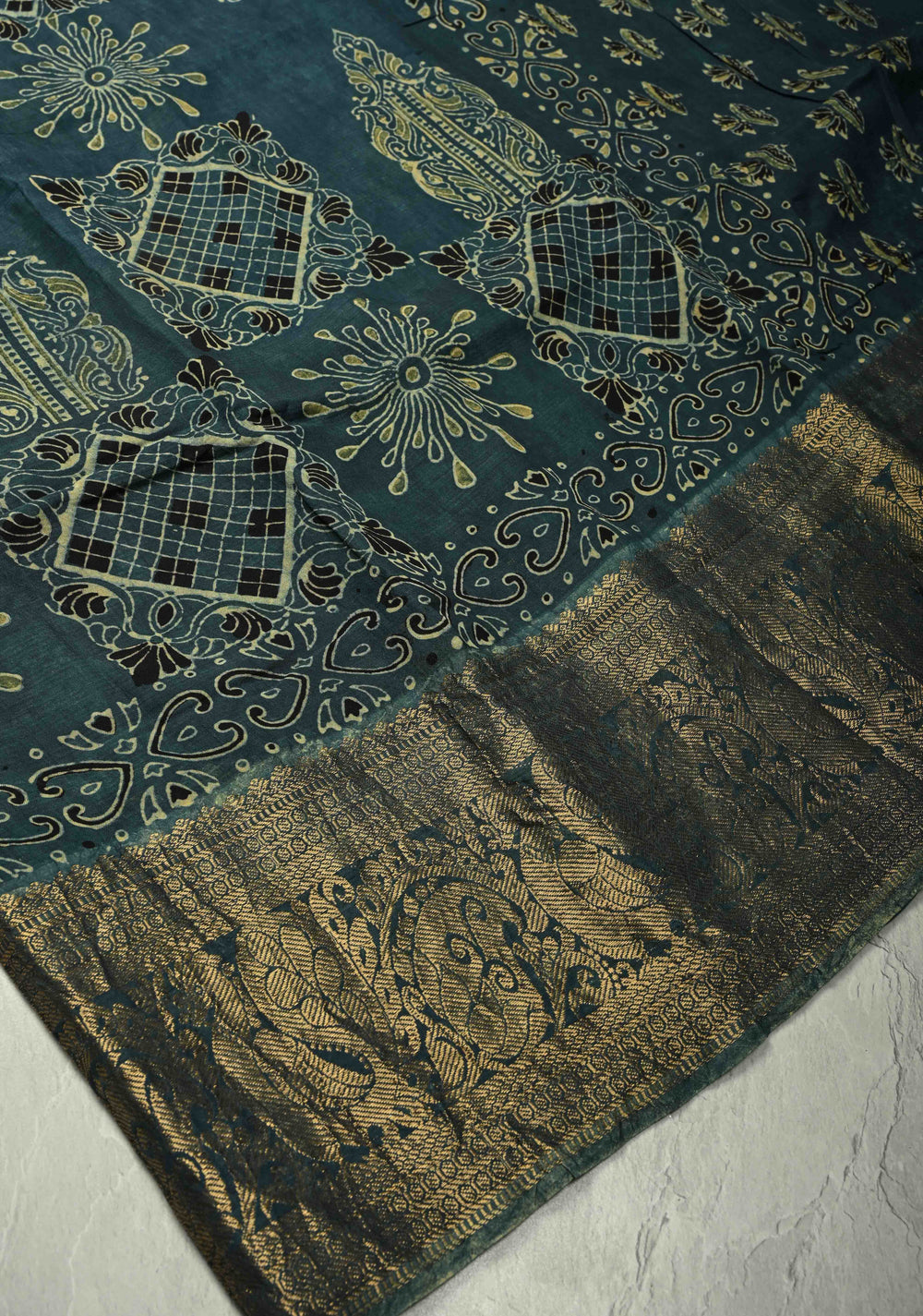 Dark Teal Modal Silk Fusion Saree with Ajrakh Hand Block Print and Zari Border