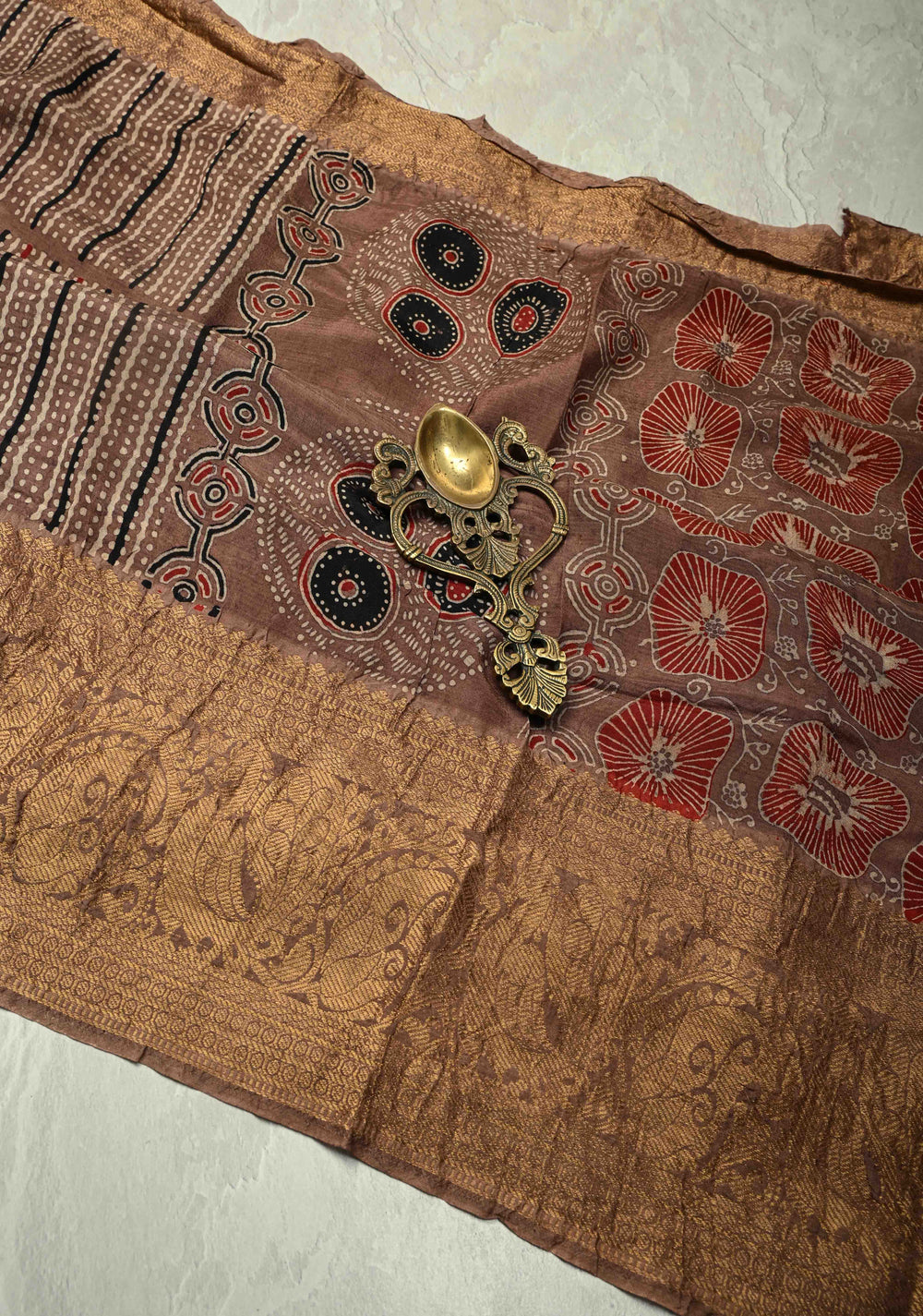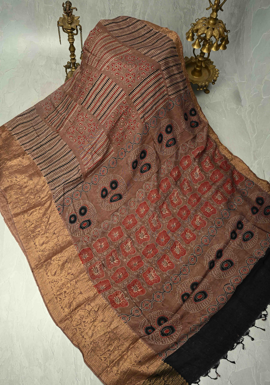 Brown Modal Silk Fusion Saree with Hand Block Print and Zari Border
