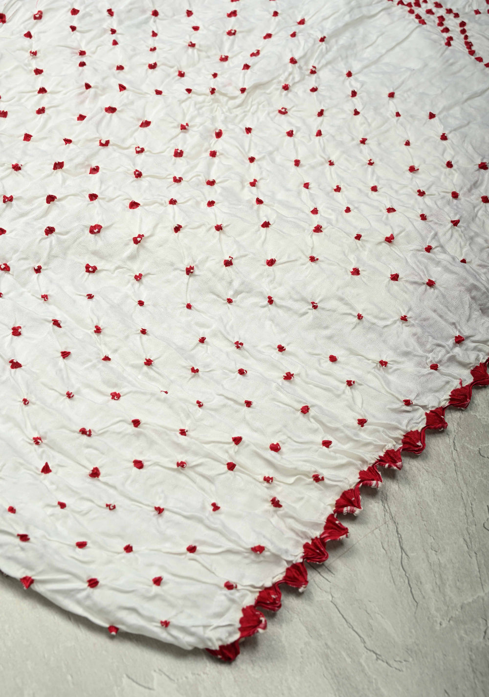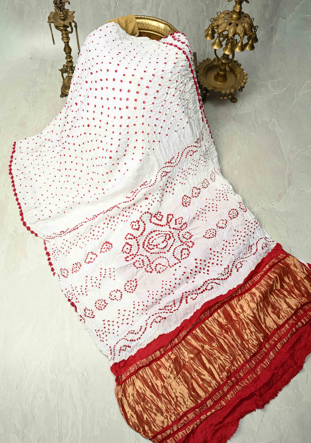 White Sarkam Bandhej on Modal Silk Saree with Kungra Borders and Crushed Pallu