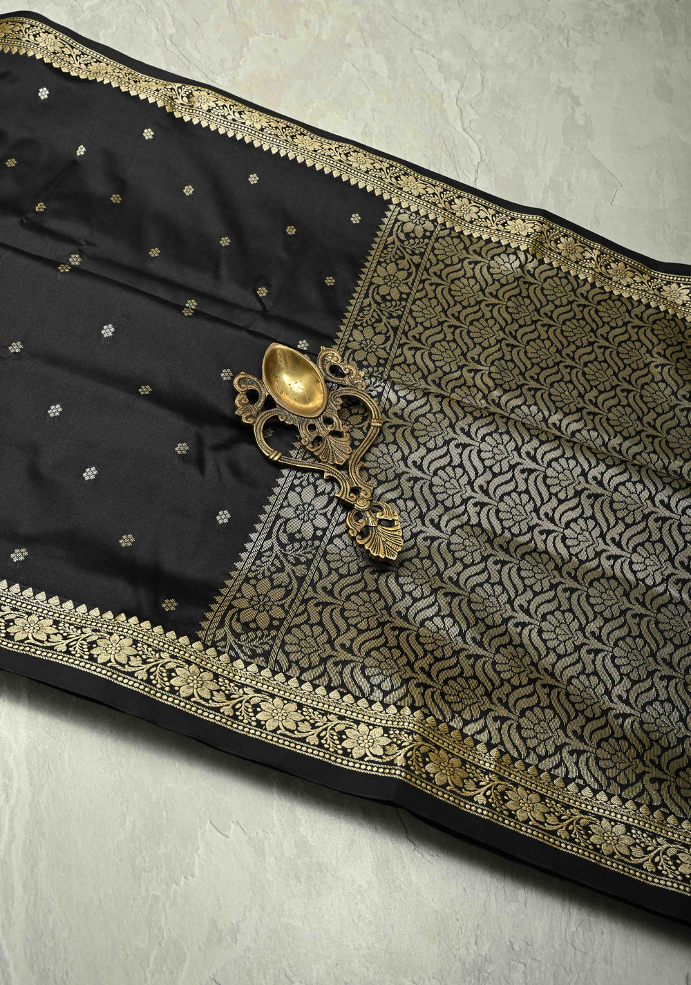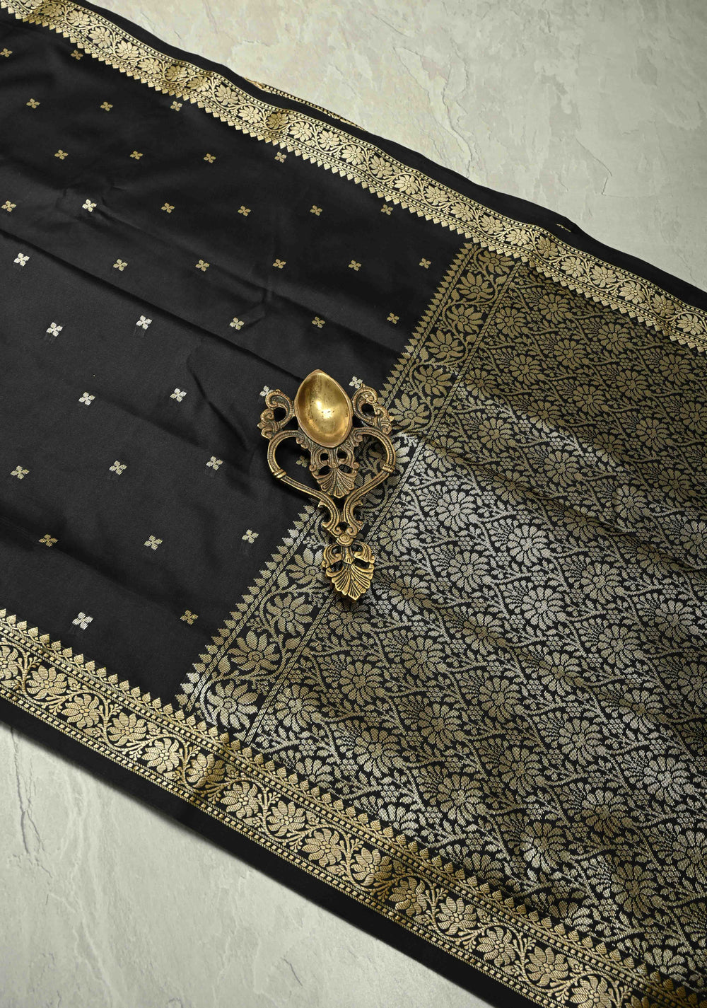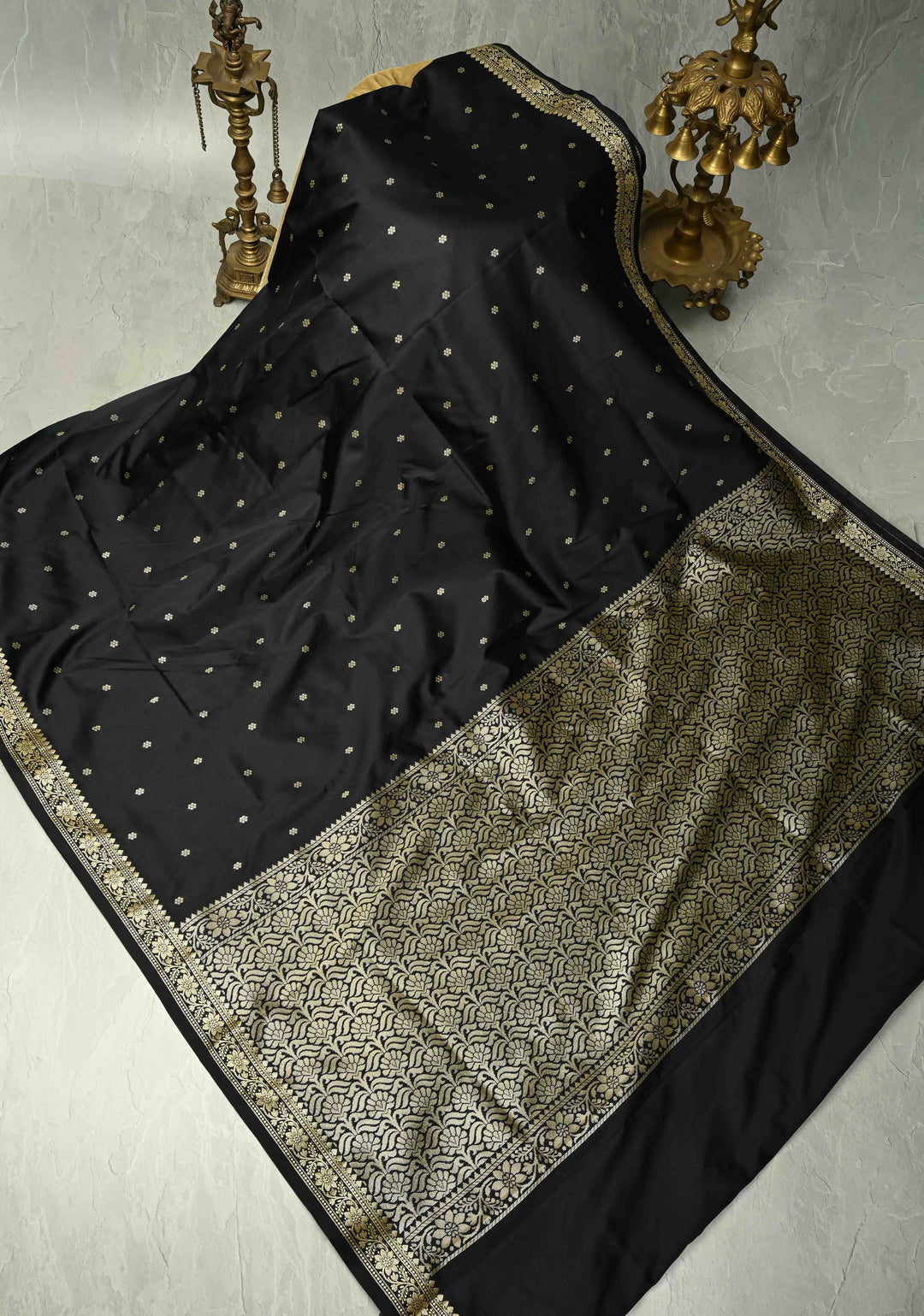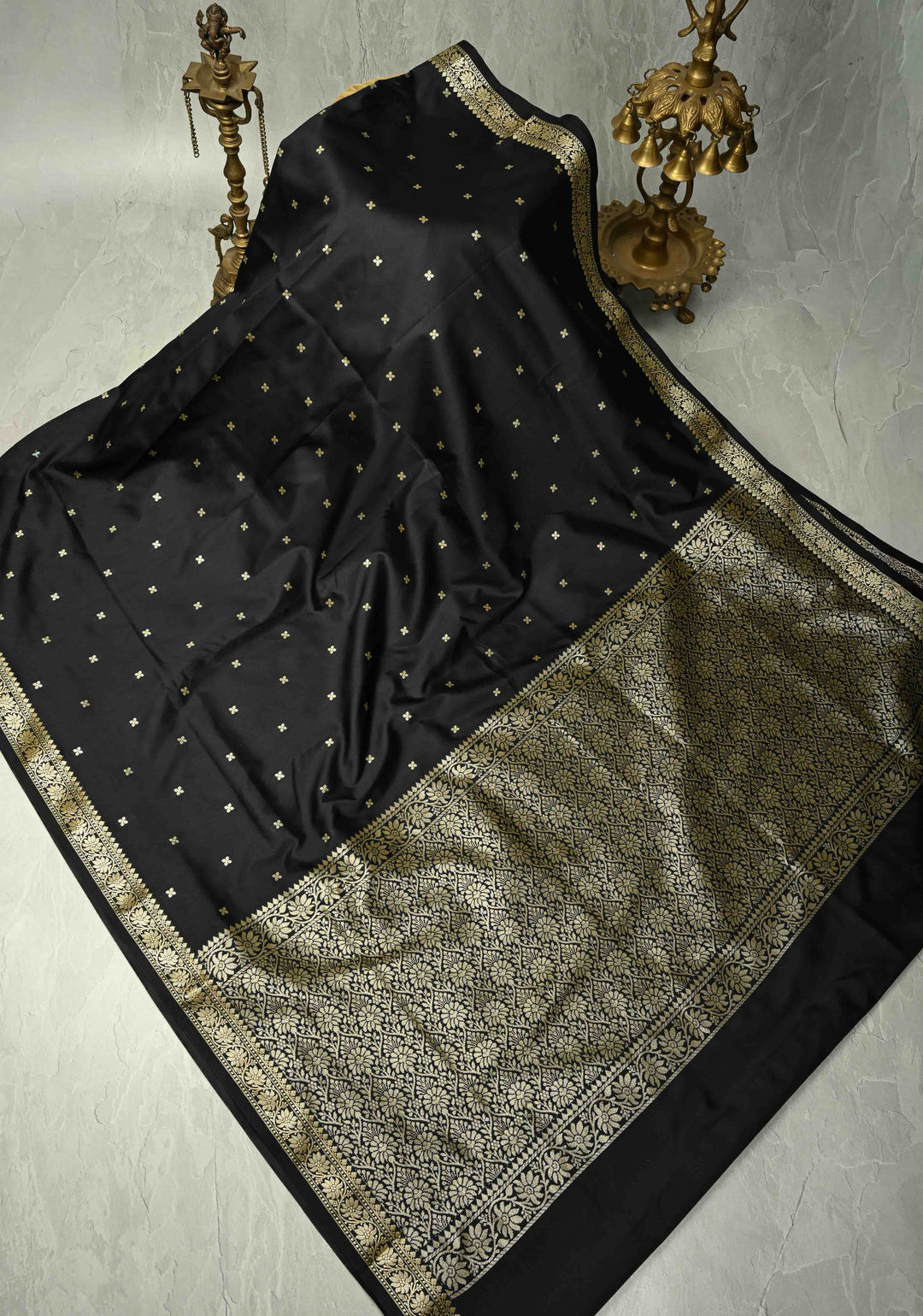 Black Banarasi Handloom Saree with Dainty Sona Rupa Kadhuwa Buttas and Fancy Lace Border | SILK MARK CERTIFIED
