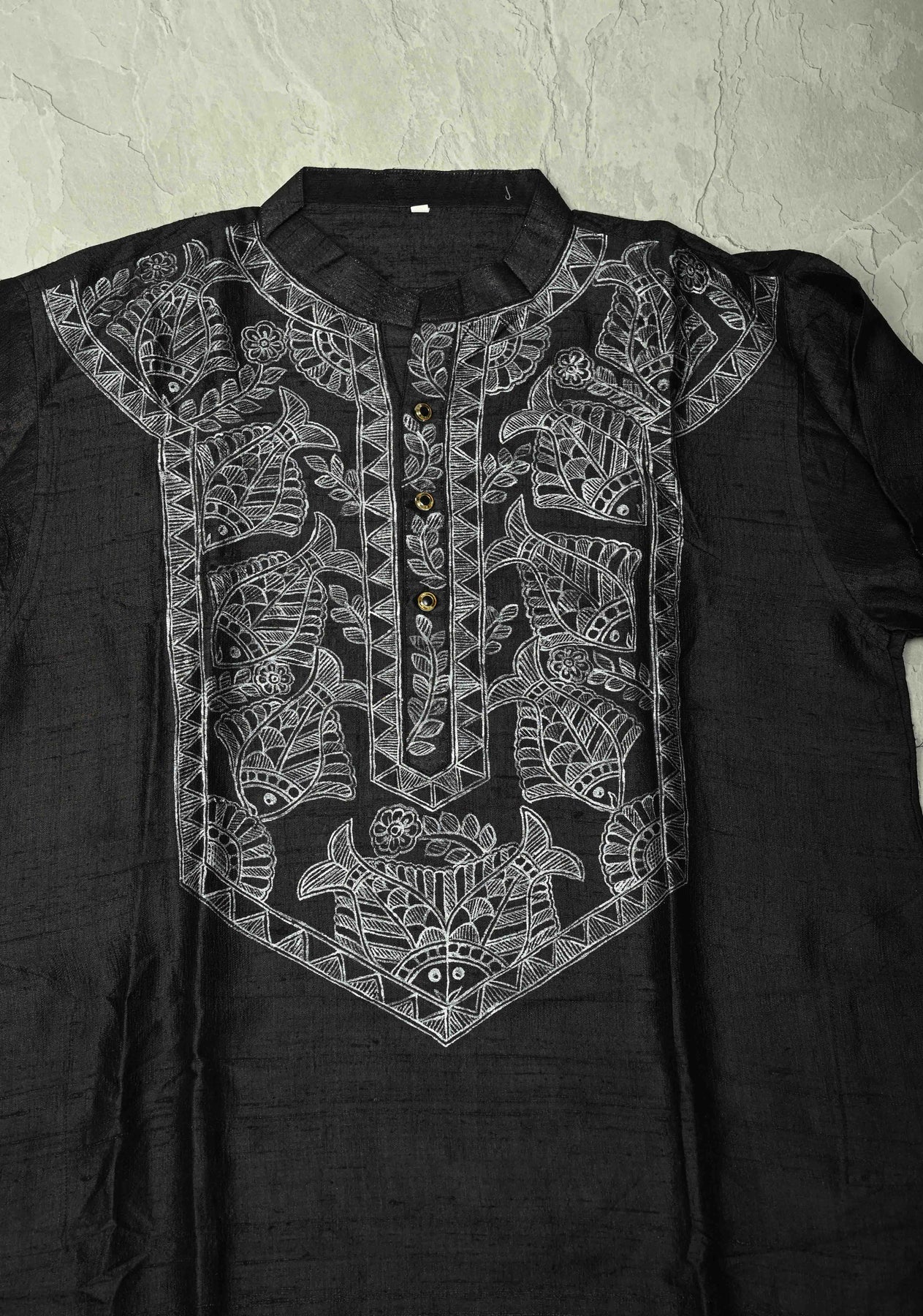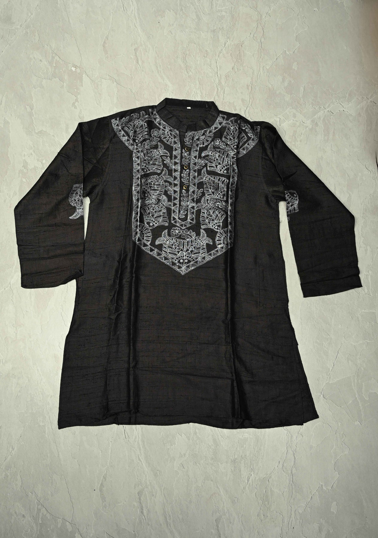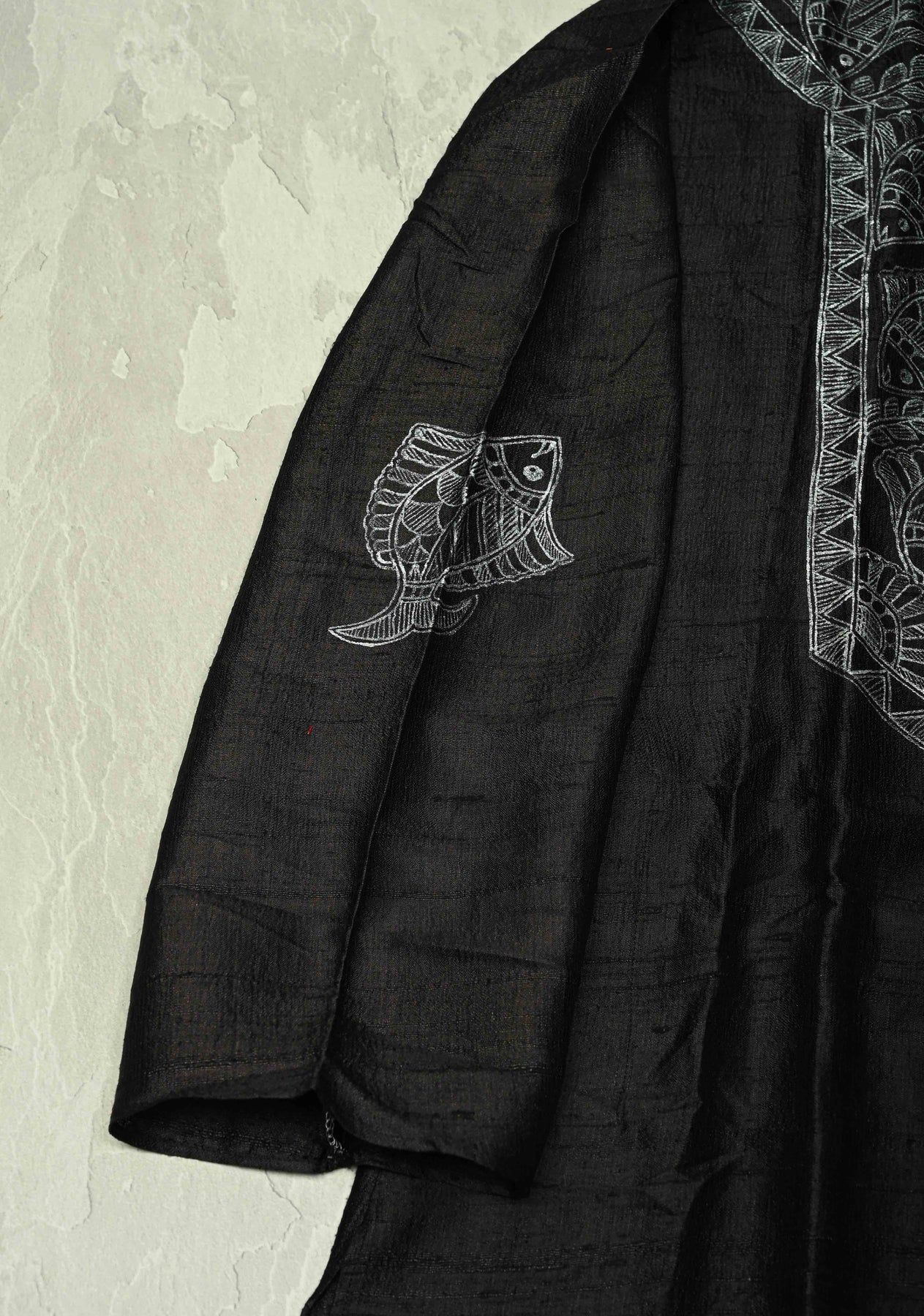 The hand-painted Madhubani fish motif—symbolizing prosperity and good fortune—adds a unique traditional charm, while the deep black base enhances the brilliance of the silver artwork. This kurta is perfect for pairing with silk pajamas, churidars, or tailored trousers to complete a refined ethnic look.
