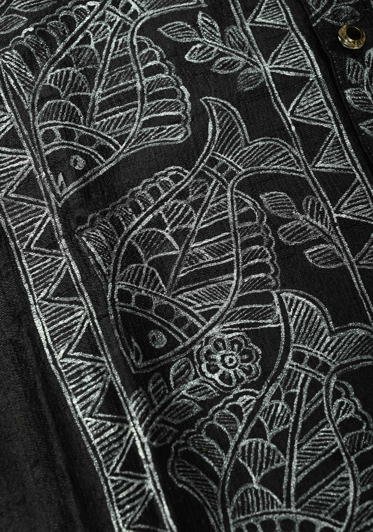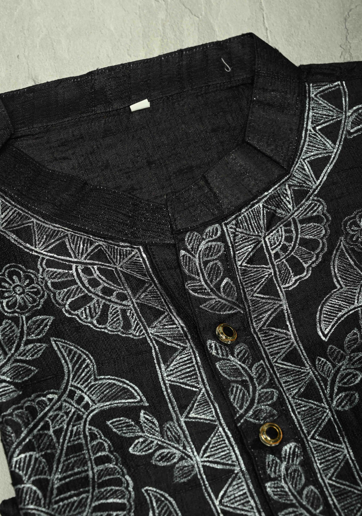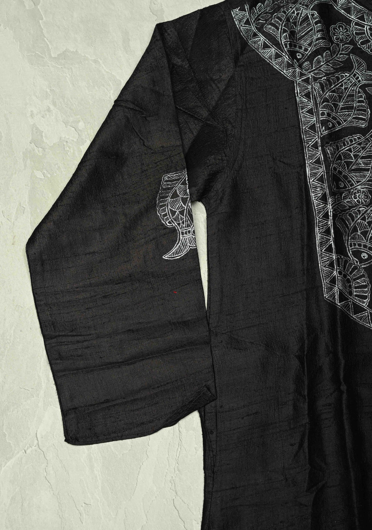 The hand-painted Madhubani fish motif—symbolizing prosperity and good fortune—adds a unique traditional charm, while the deep black base enhances the brilliance of the silver artwork. This kurta is perfect for pairing with silk pajamas, churidars, or tailored trousers to complete a refined ethnic look.