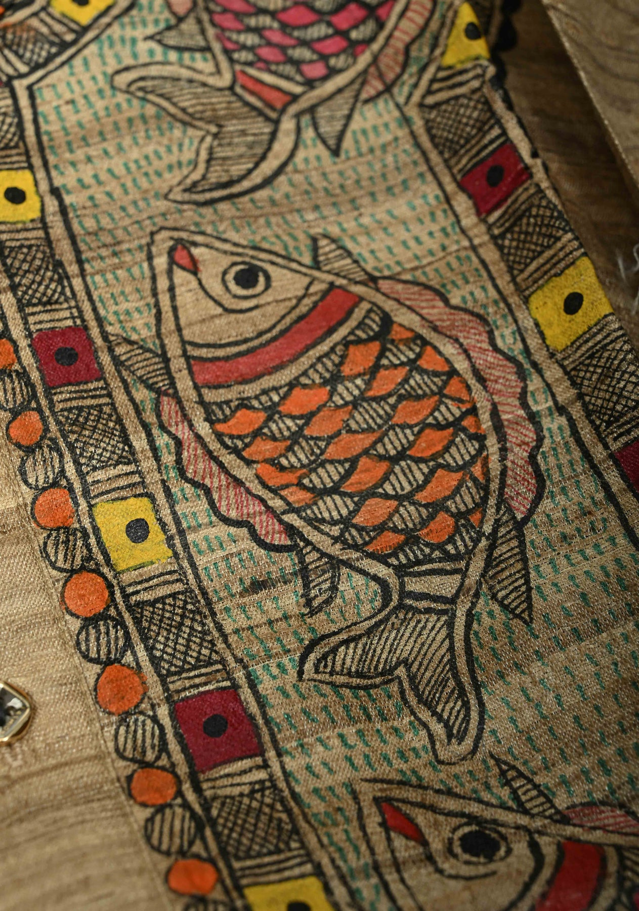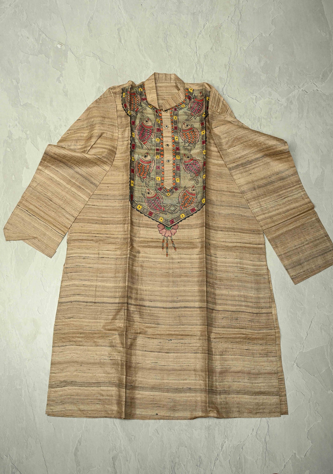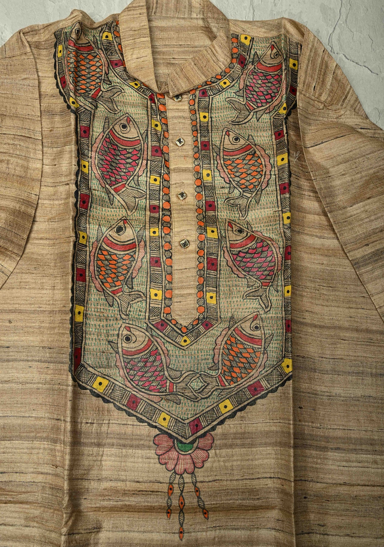 This Natural Color Tussar Silk Full Sleeves Men’s Kurta is a refined blend of traditional craftsmanship and elegant ethnic styling. Made from authentic Tussar silk, it offers a rich texture, natural sheen, and comfortable fit ideal for festive and cultural occasions. The highlight of this kurta is the exquisite Machli (fish) Madhubani hand painting, meticulously crafted by skilled artisans to symbolize prosperity and harmony. Its intricate detailing and artisanal charm make it a standout piece, perfect for weddings, pujas, and special celebrations where you want to showcase timeless Indian heritage.
