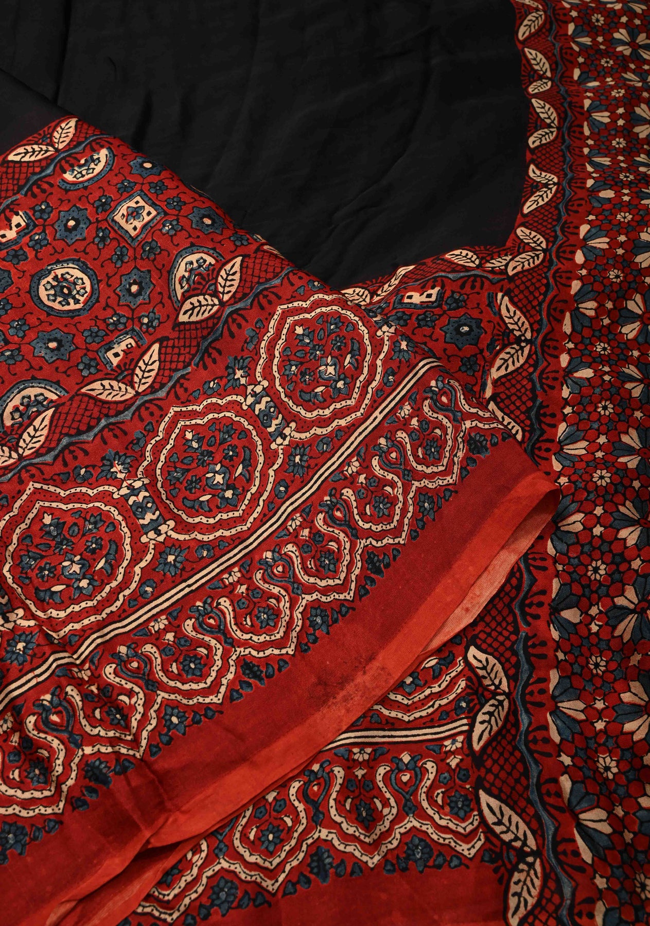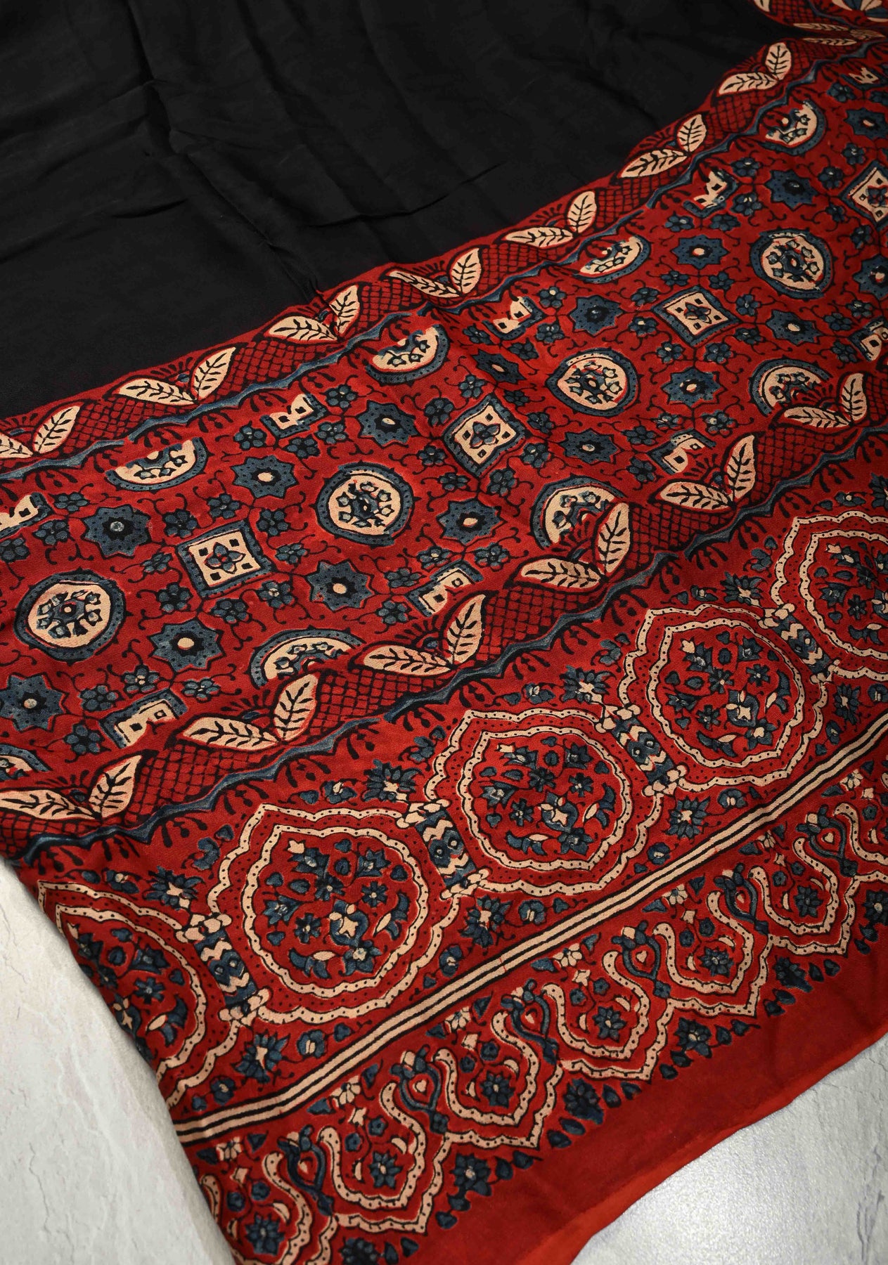 This elegant Black Modal Silk Saree combines contemporary style with traditional artistry. Crafted from soft, flowing modal silk, it offers a lightweight drape and a subtle sheen for effortless elegance. The saree features a striking Ajrakh hand block print on its wide border, showcasing intricate geometric and floral patterns inspired by classic Indian block printing techniques. The crushed pallu adds texture and modern appeal, creating a perfect balance between tradition and contemporary fashion. Ideal for casual gatherings, festive occasions, or cultural events, this saree is a versatile and stylish addition to any wardrobe.