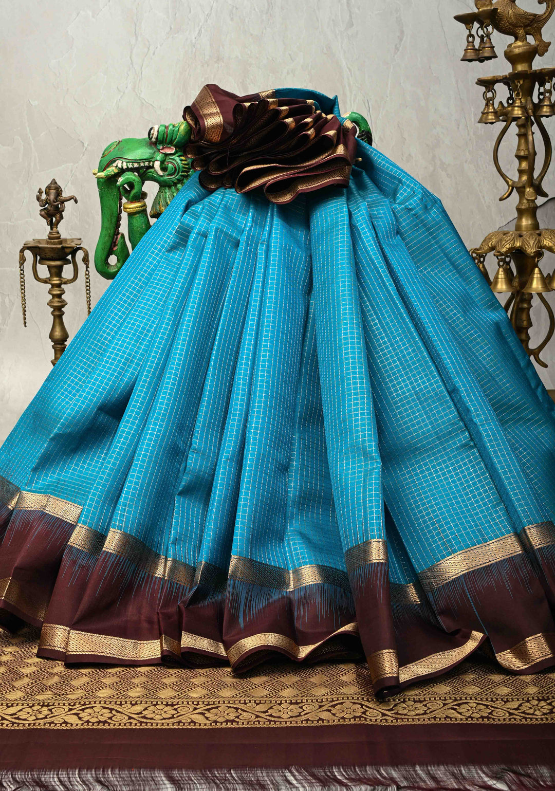 Ananda Blue Podi-Kattam Zari Checks on Pure Kanjivaram Soft Silk Saree with Coffee Brown Rettiapet Zari Border | SILK MARK CERTIFIED
