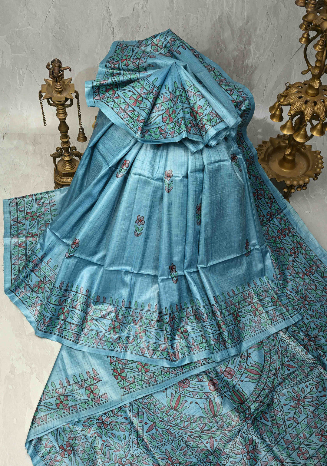Turquoise Sanskriti Pushpanjali Tussar Saree with Madhubani hand painting | SILK MARK CERTIFIED