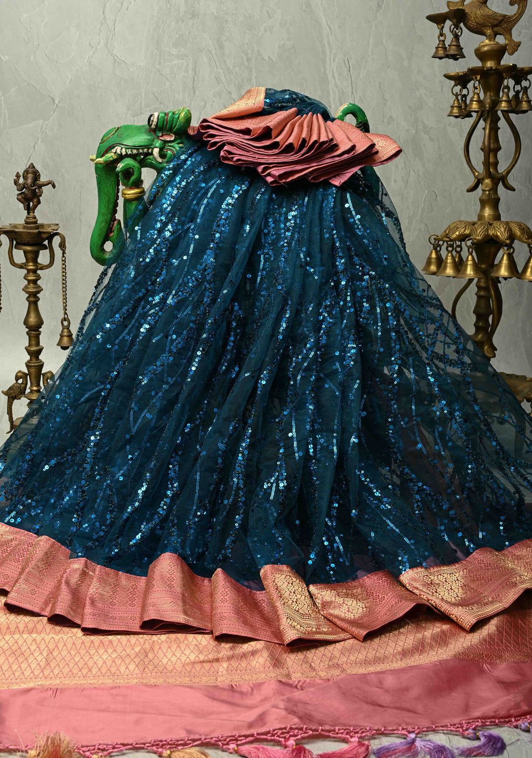 Peacock Blue tone on tone Sequin on Net Fusion Saree with Two Side Banarasi Pure Silk Border and Pallu