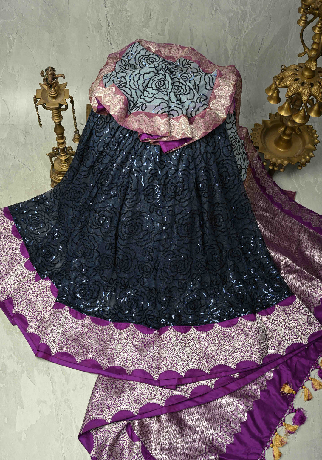 Ombre Blue Shades tone on tone Sequin on Net Saree with Rose Jaal and Two Side Fusion Banarasi Scallop Border
