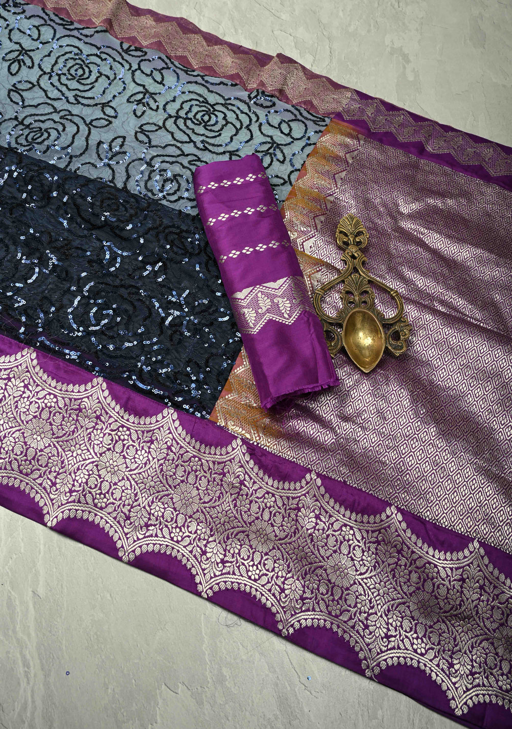Ink Blue Meenakari Detailing on Banarasi Semi Mashru Silk Saree with Floral Jaal and Zari Border
