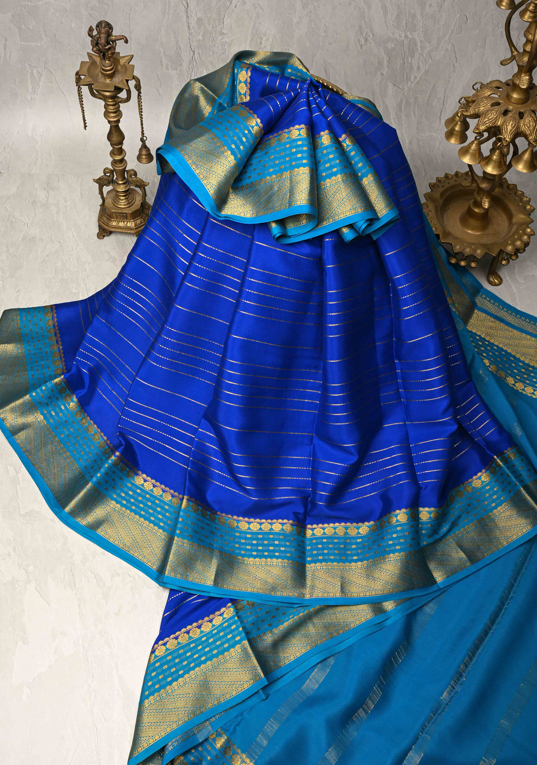 Bluish Cyan Pure Mysore Silk Saree with Zari Stripes on Royal Blue and Zari Border in KSIC Grade Thickness | SILK MARK CERTIFIED