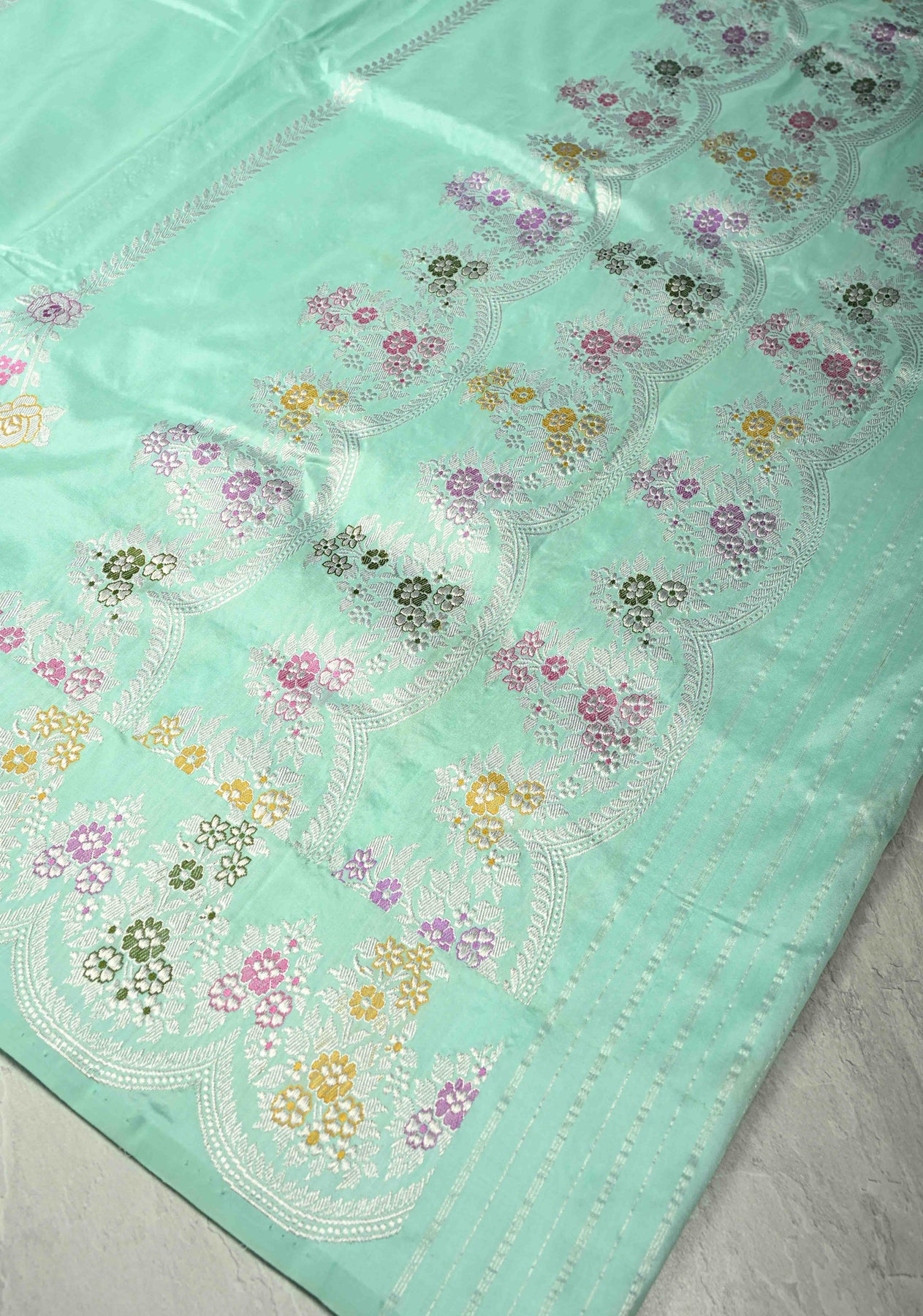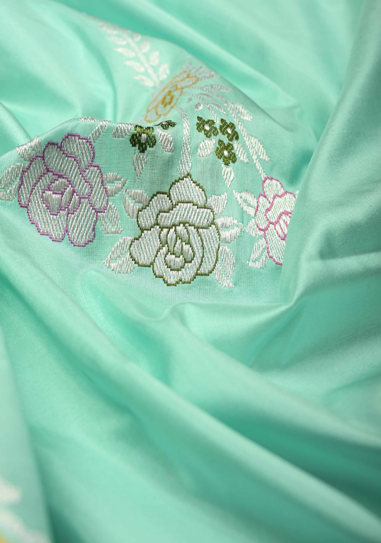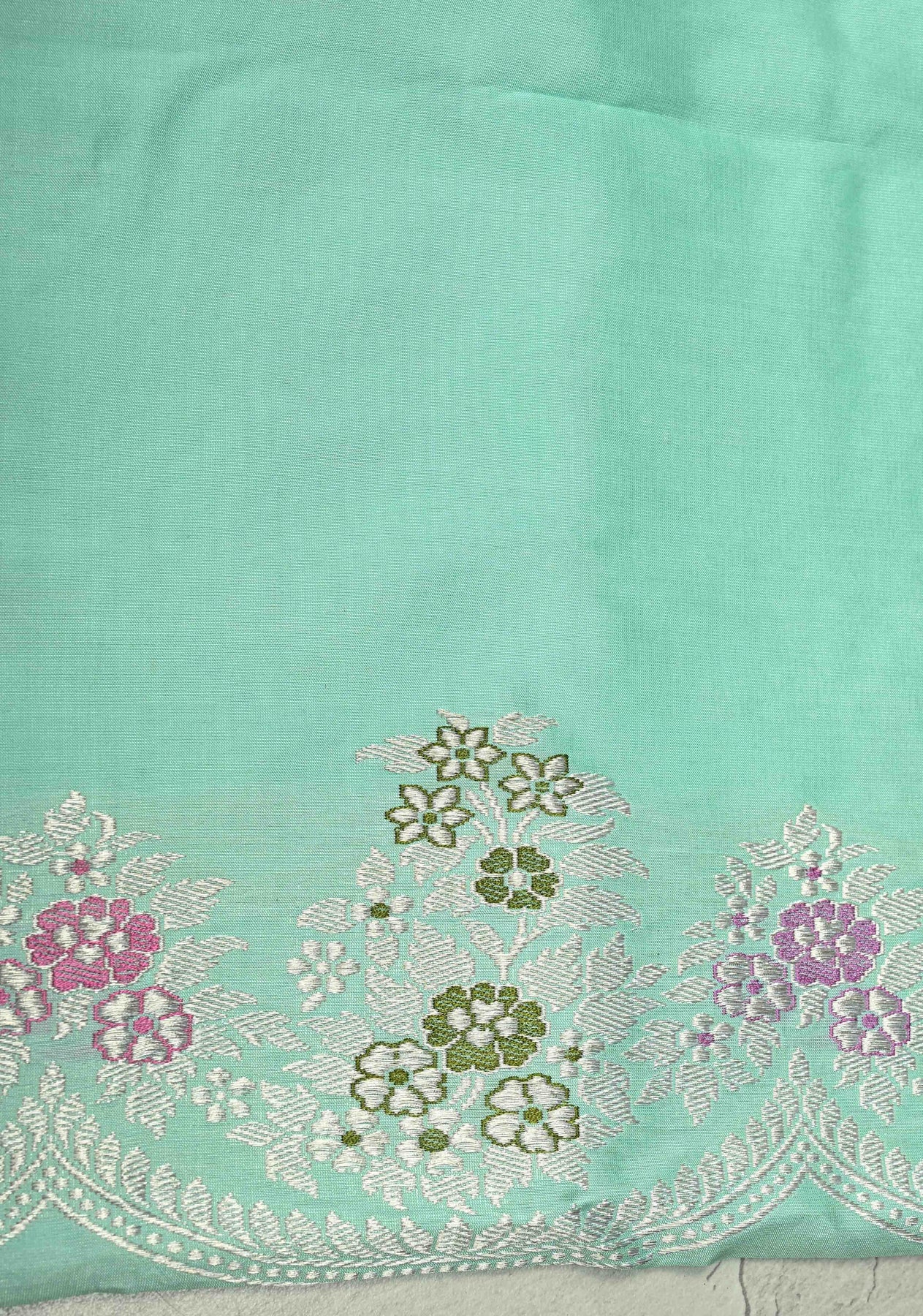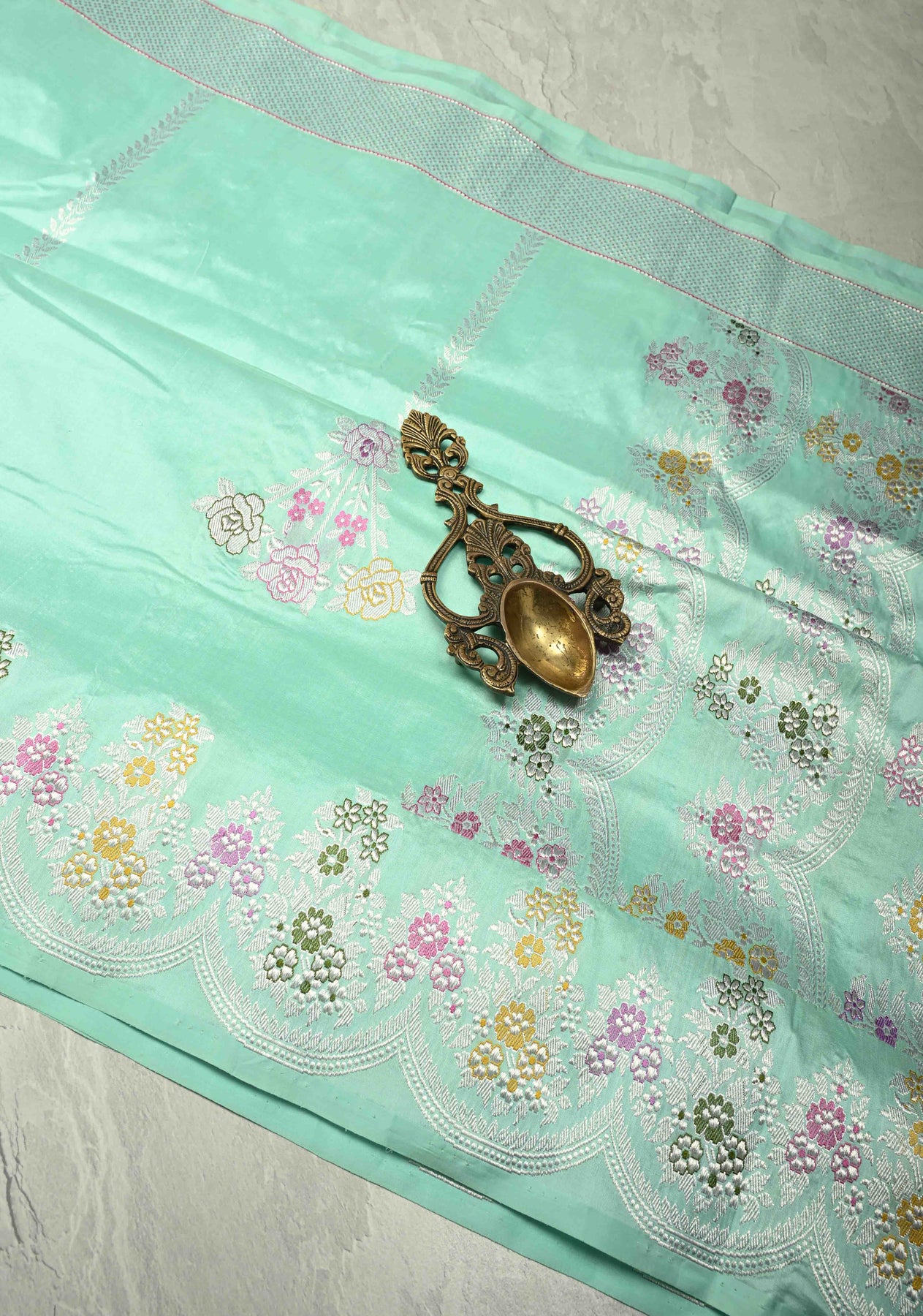 This exquisite Aqua Blue Pure Banarasi Katan Silk Saree radiates timeless elegance and exquisite craftsmanship. Woven from premium Katan silk, the saree features delicate Meenakari detailing that adds vibrant and intricate artistry across its serene aqua blue fabric, enhancing its luxurious charm. The rich zari border beautifully frames the saree, adding a shimmering finish that perfectly complements the cool, refreshing hue. Ideal for weddings, festivals, and special occasions, this saree embodies the perfect blend of traditional heritage and contemporary grace, making it a stunning choice for any celebration.