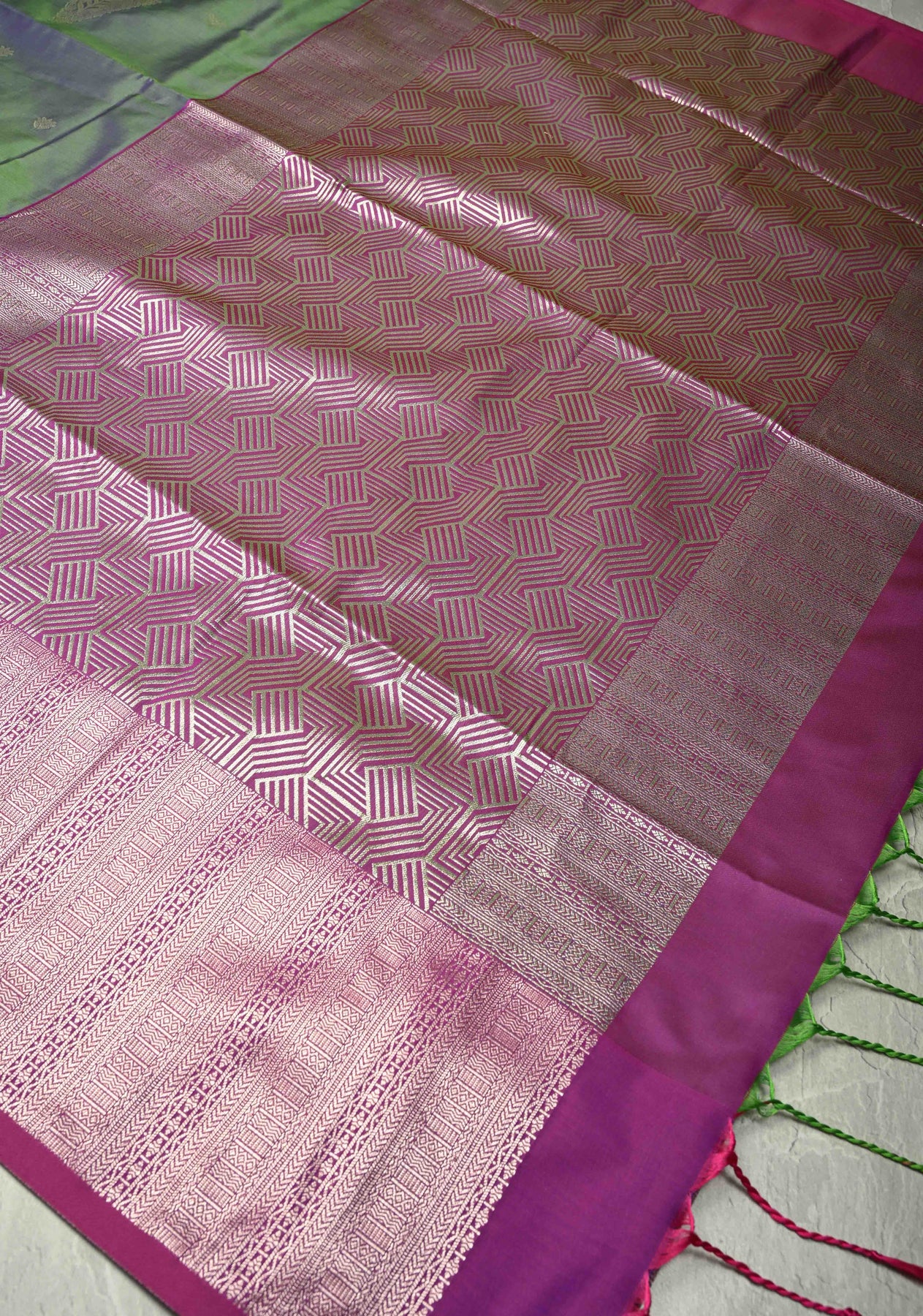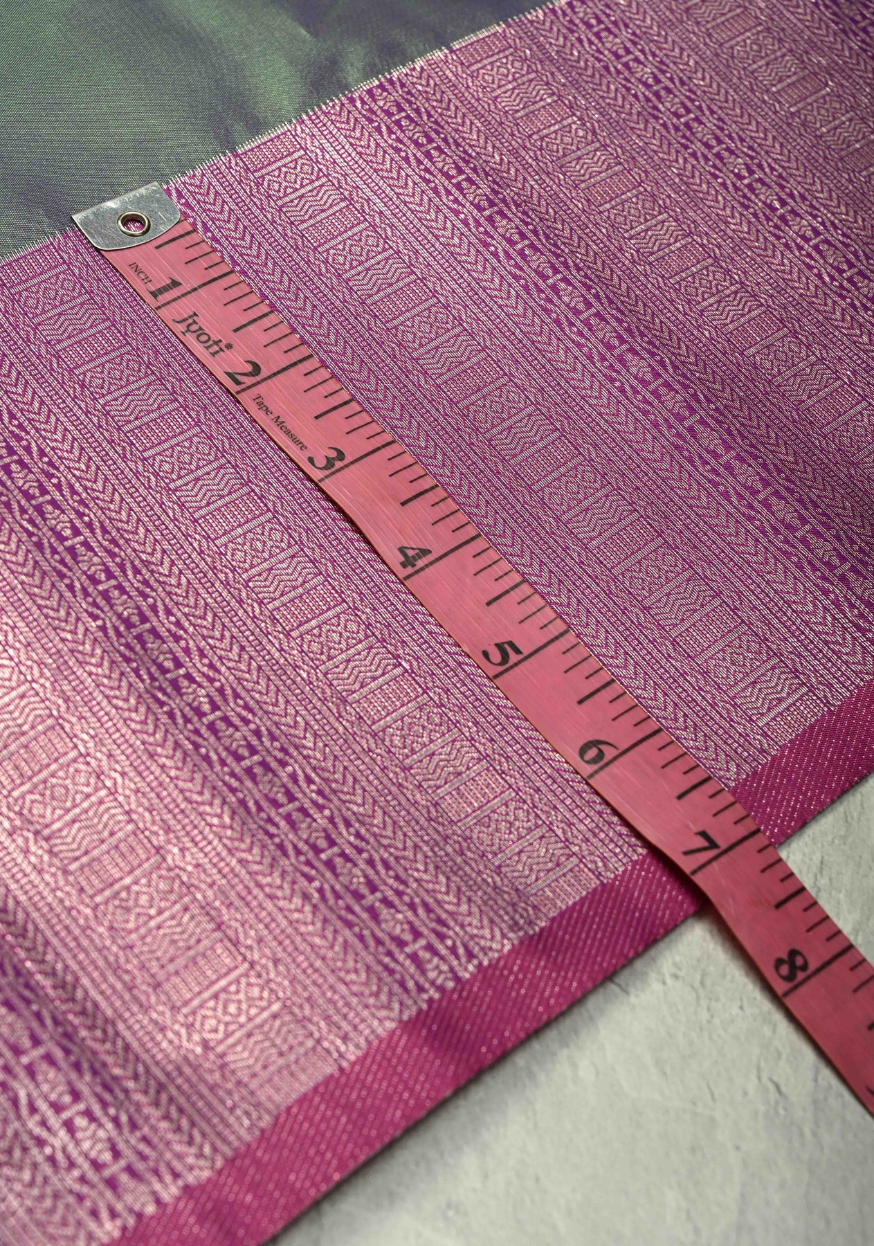 Exude timeless elegance with this Blue-Green Dual Tone Kanchi Semi Silk Saree. The dual-tone weave blends serene blue and green shades, creating a radiant, shifting sheen that captures the light beautifully. The saree is adorned with delicate silver zari buttas, adding subtle sparkle and enhancing its traditional charm. Finished with a contrast wide zari border, the saree achieves a regal and sophisticated look. Lightweight, lustrous, and gracefully draping, it is perfect for weddings, festive celebrations, and cultural occasions.