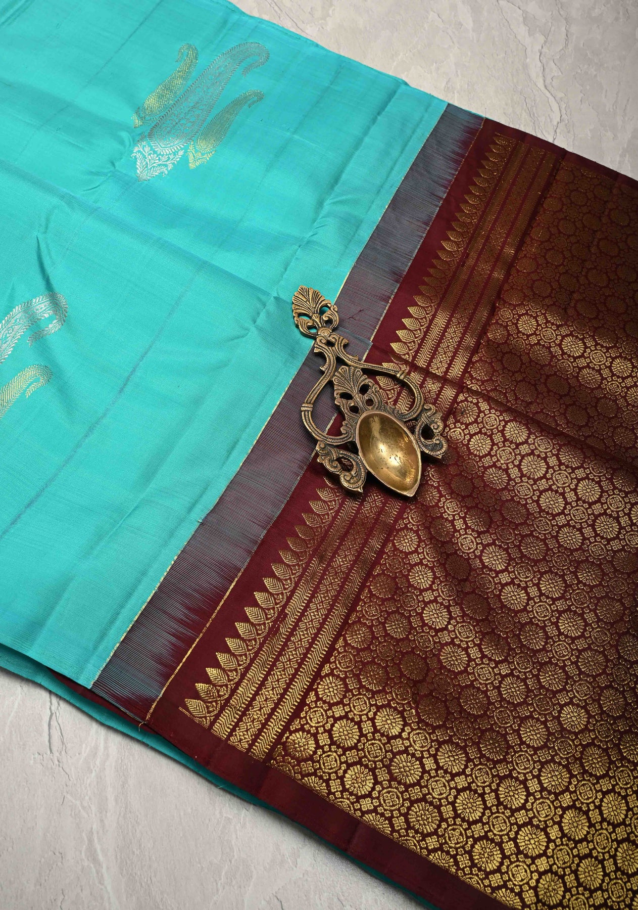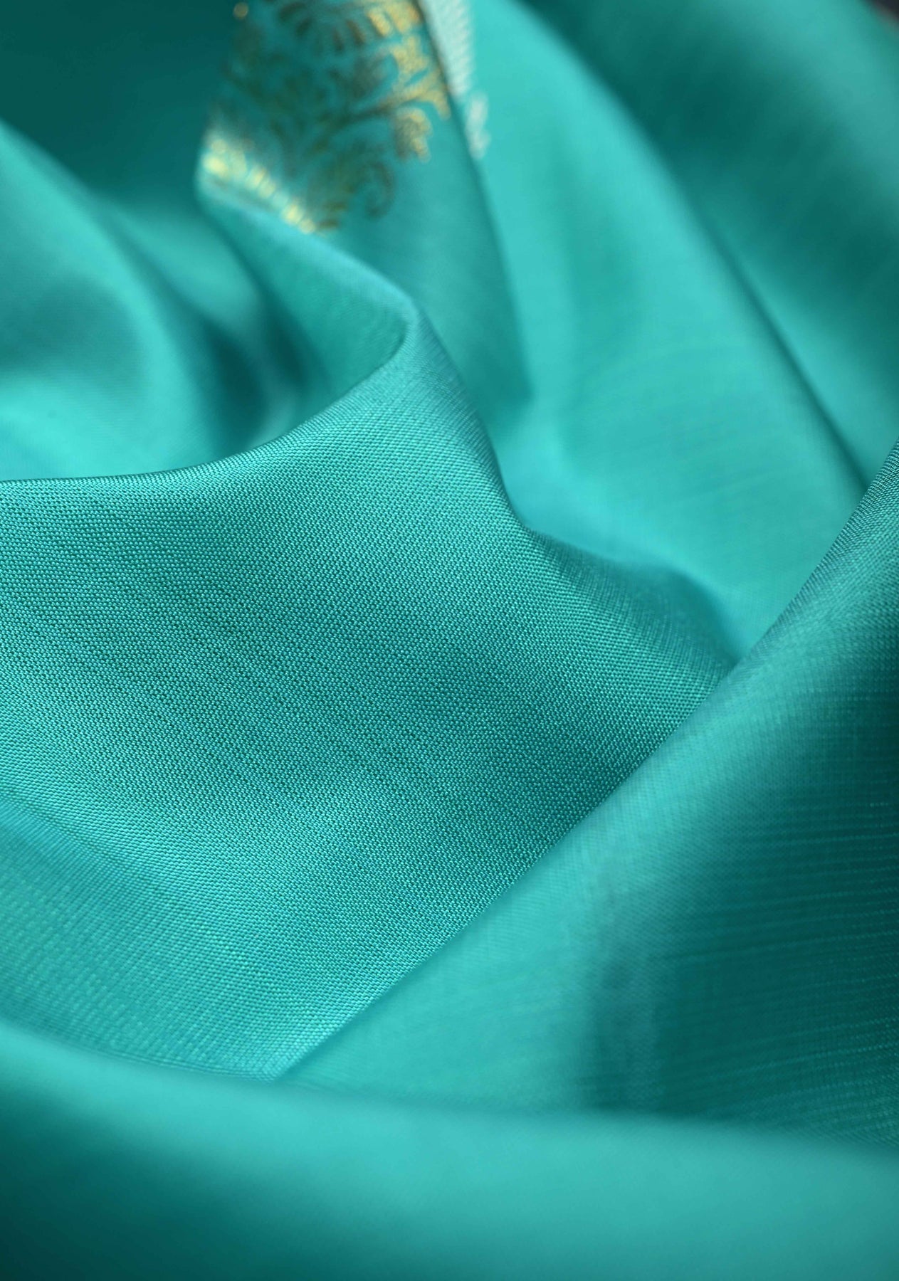 Make a striking statement with this Cyan Blue Borderless Pure Kanjivaram Silk Saree, a perfect blend of vibrant color and traditional craftsmanship. The cyan blue hue adds a refreshing and lively touch, while the borderless design offers a contemporary, elegant silhouette. Adorned with intricate gold and silver paisley buttas woven throughout, the saree exudes subtle opulence and timeless charm. Crafted from pure Kanjivaram silk, it boasts a rich texture and lustrous finish, making it an ideal choice for weddings, festivals, and special occasions where you want to showcase both sophistication and heritage.
