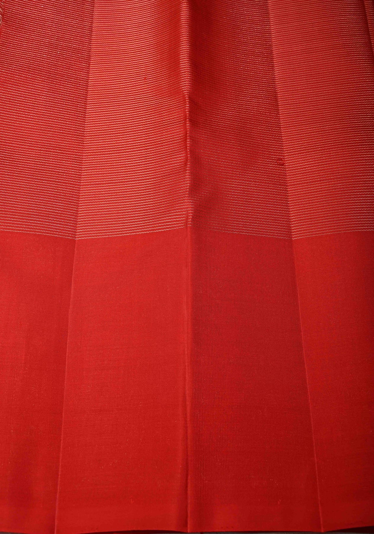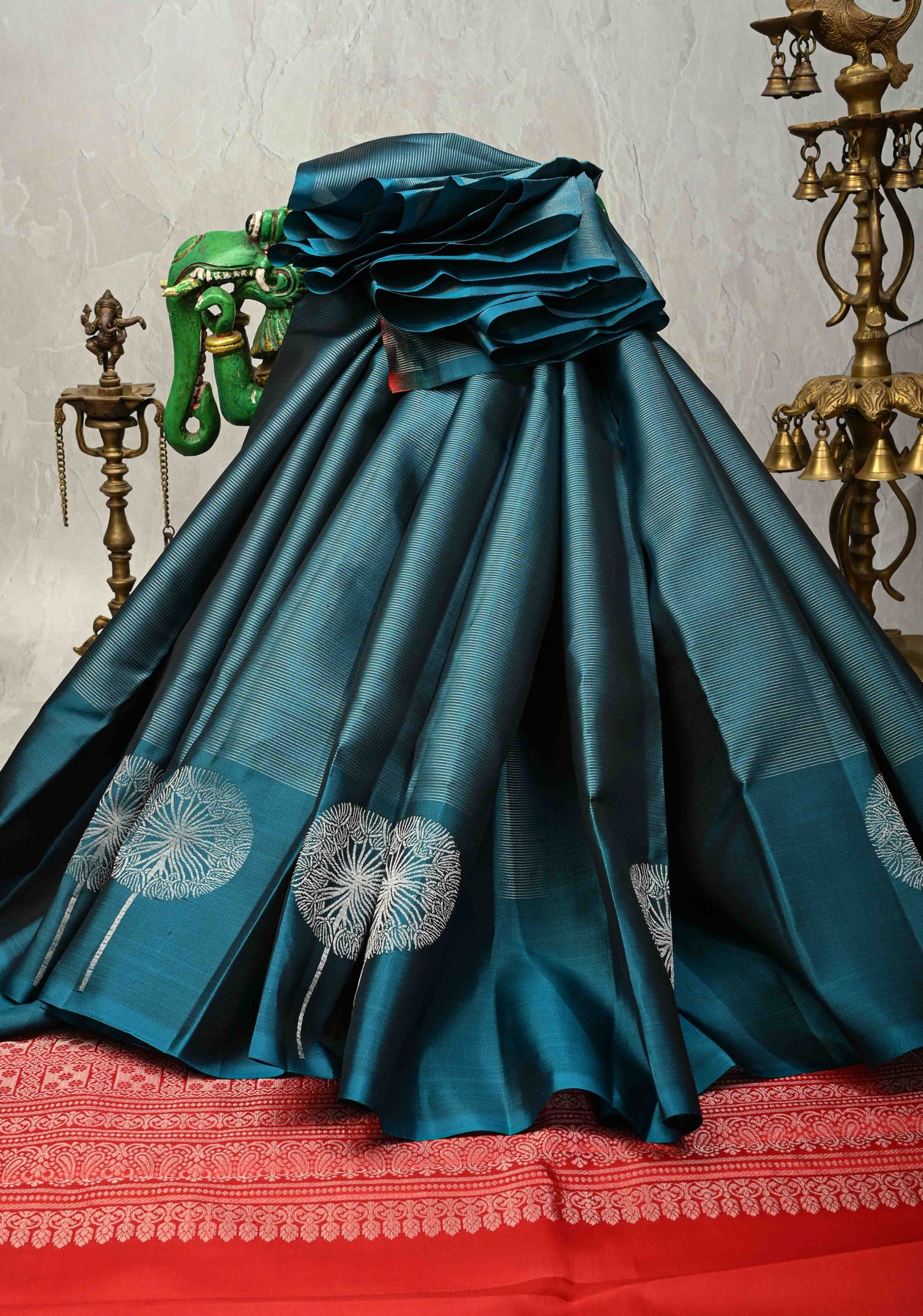 The deep teal body is accentuated with classic Vairaoosi silver zari stripes, lending a subtle shimmer and refined sophistication. Enhancing its heritage appeal is the intricately woven tree motif border, symbolizing prosperity and timeless craftsmanship. A perfect choice for those who value traditional Kanjivaram aesthetics with distinctive detailing.