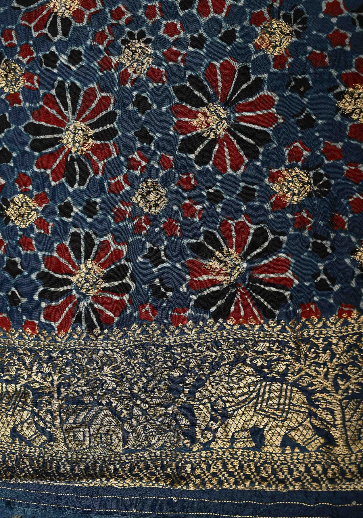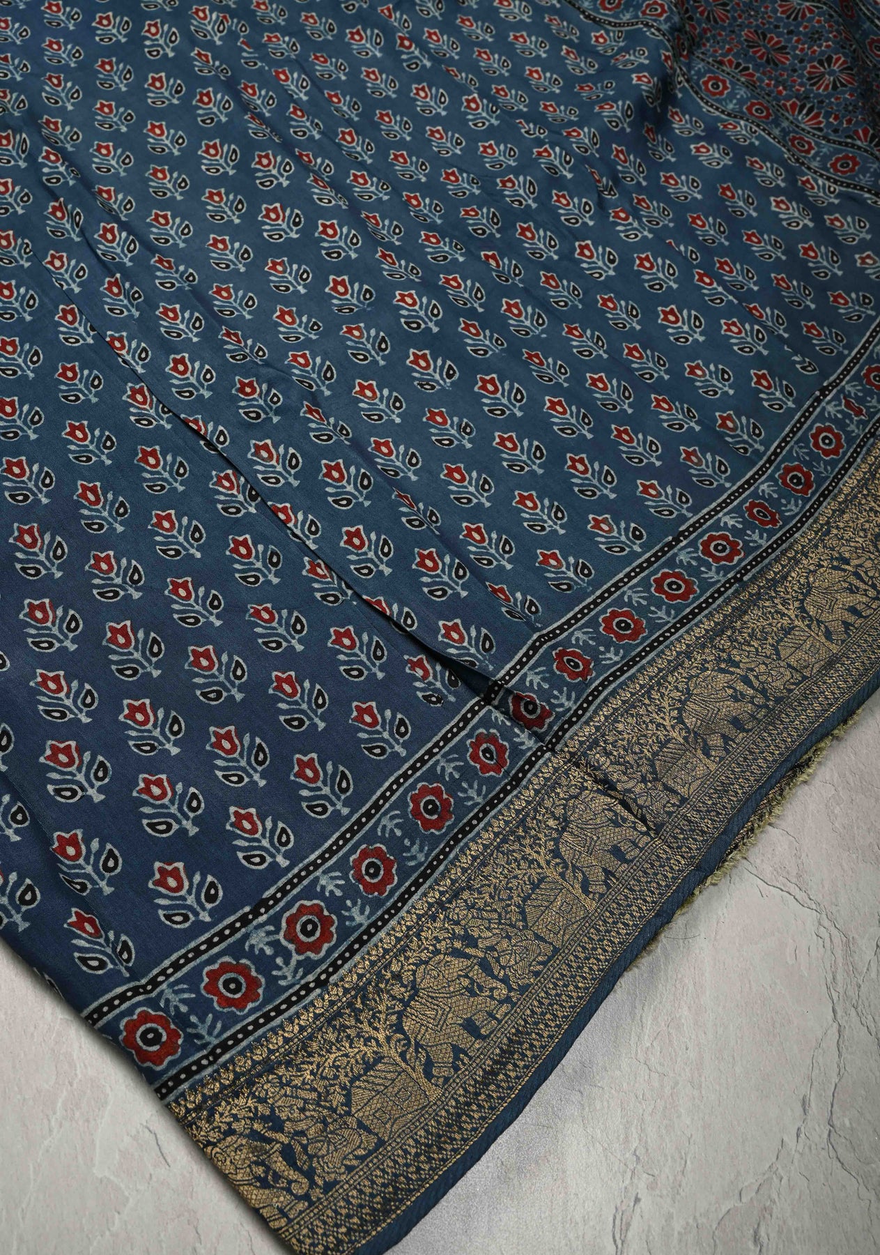 Immerse yourself in timeless elegance with this Indigo Ajrakh Hand Block Print Saree, beautifully crafted on soft and luxurious Dola silk. Showcasing intricate Ajrakh patterns in natural indigo dyes, the saree is a celebration of traditional craftsmanship. The rich design is elevated with a fancy zari border that adds a regal touch, while the pallu is adorned with finely detailed elephant motifs, symbolizing strength and grace. Perfect for festive occasions, weddings, or cultural events, this saree seamlessly blends heritage art with refined sophistication.