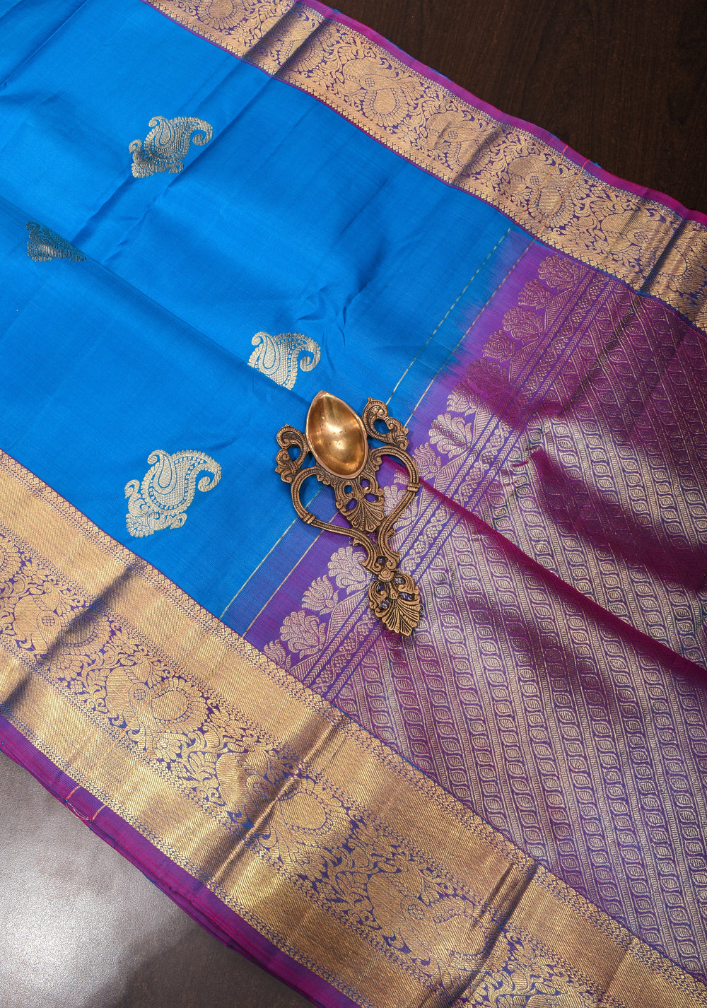 Exquisite Pure Kanjivaram Silk Saree in Blue with Zari Motifs and Zari Border | SILK MARK CERTIFIED