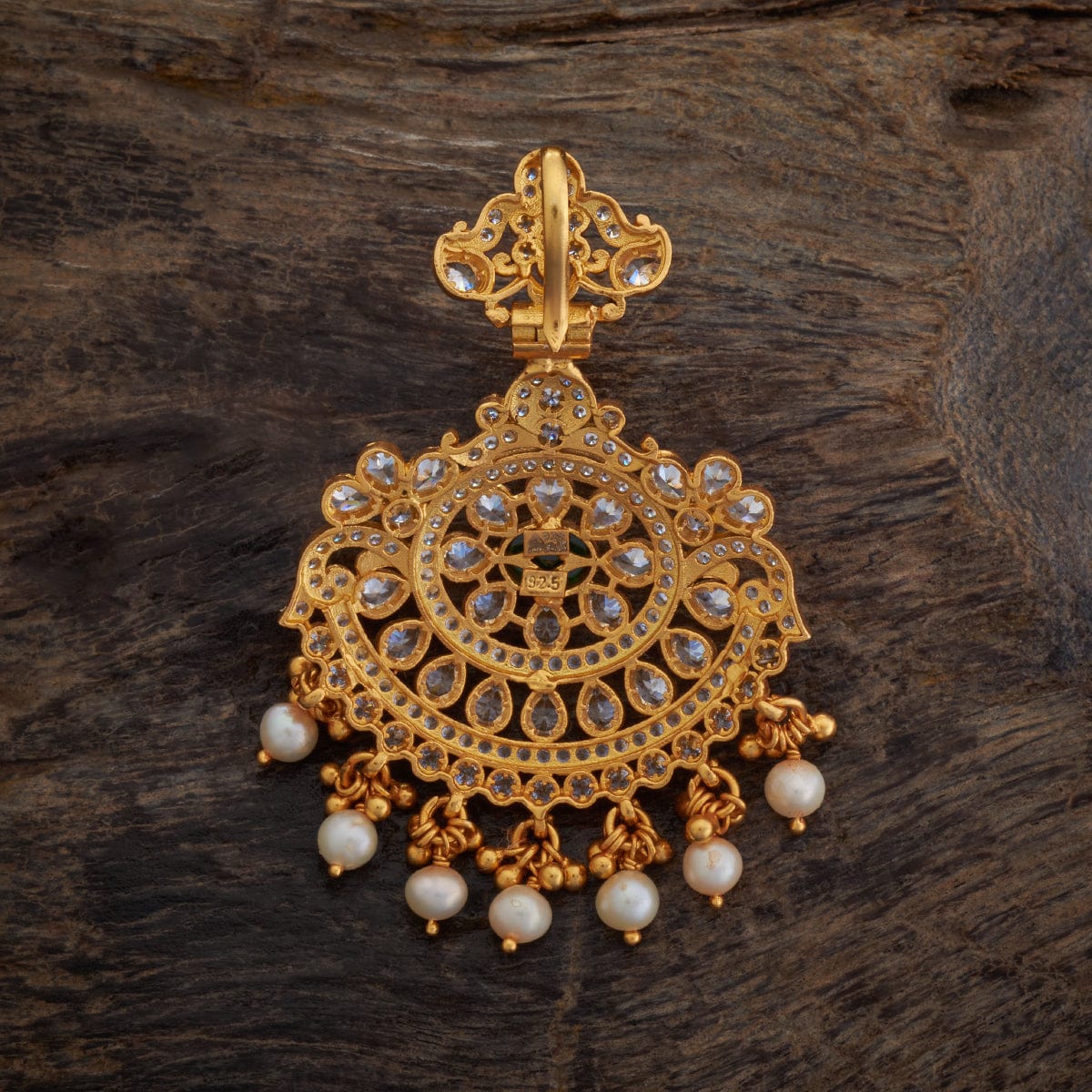 92.5 Pure Silver Flower Motif Temple Pendant With CZ And Green Stone And Dangling Pearls And Beads
