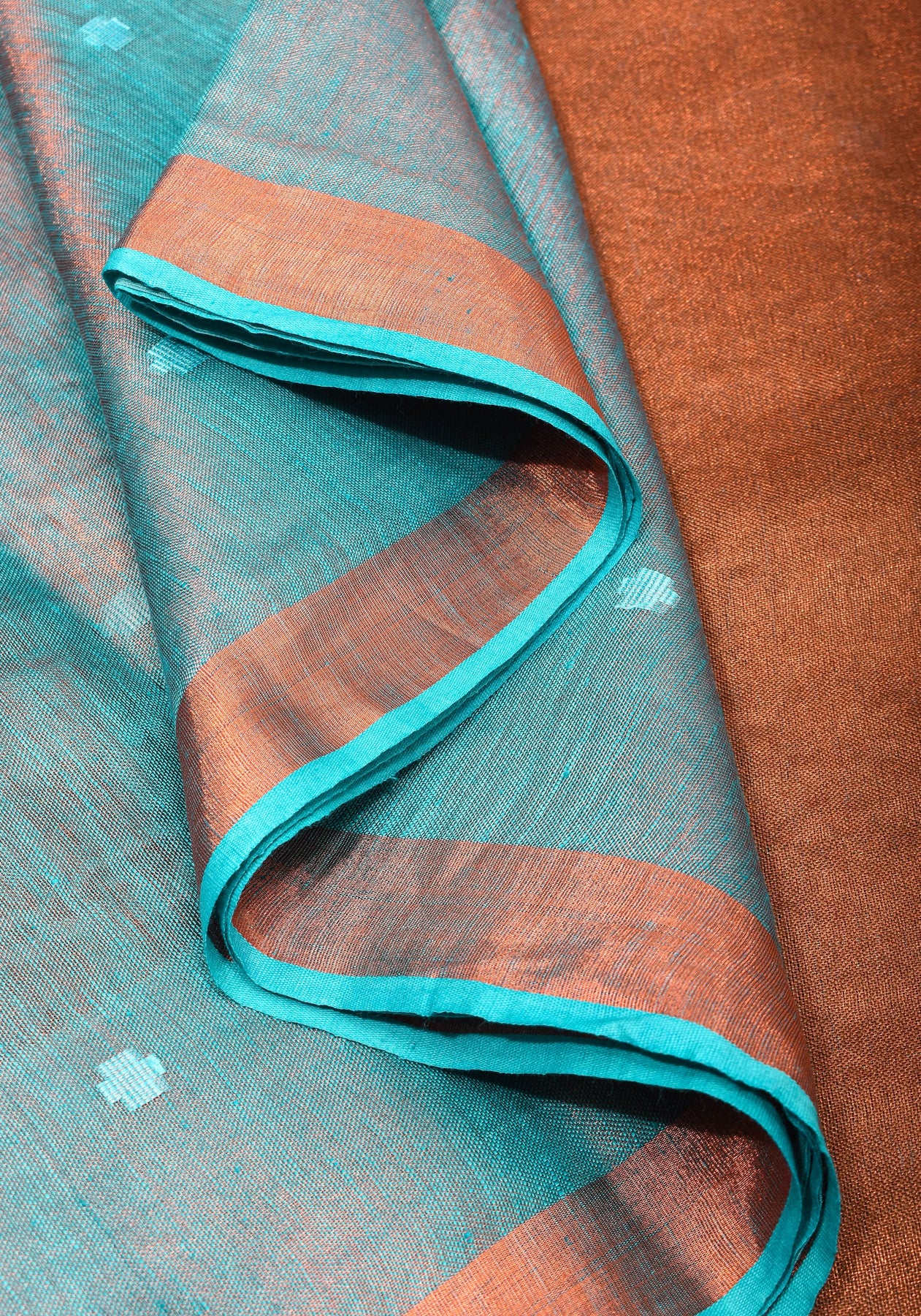 Set in a unique copper tissue and linen interweave that you are not to find elsewhere, this Teal hue saree comes with the breathability of natural linen and the shimmer of tissue! Thread buttas add texture, while the grand tissue pallu and copper zari border finished with long tassels makes a grand statement!