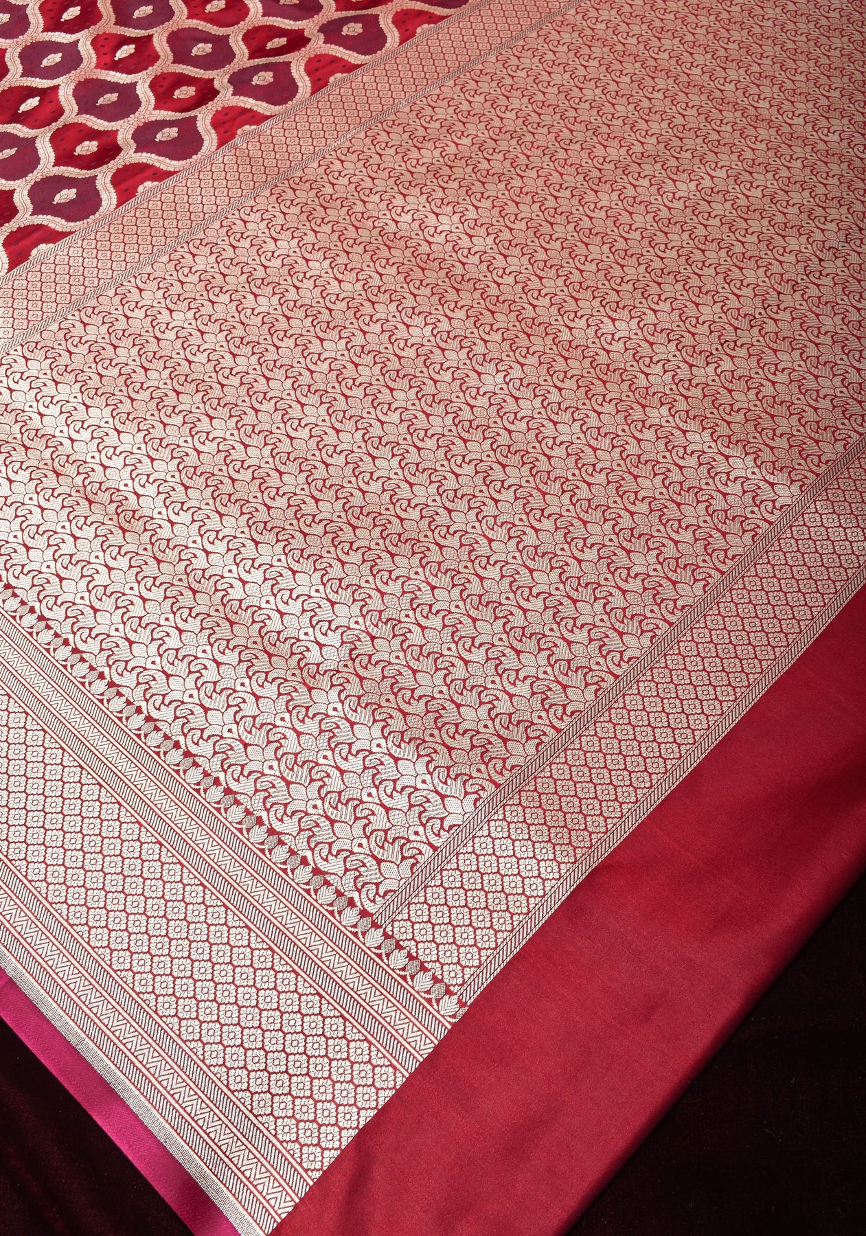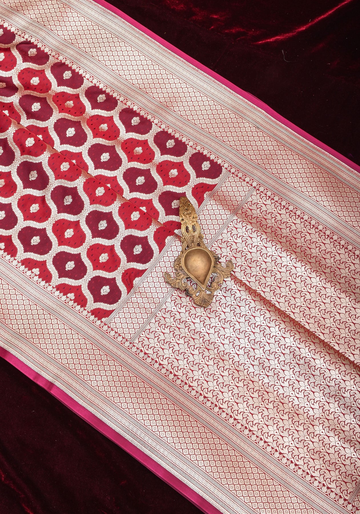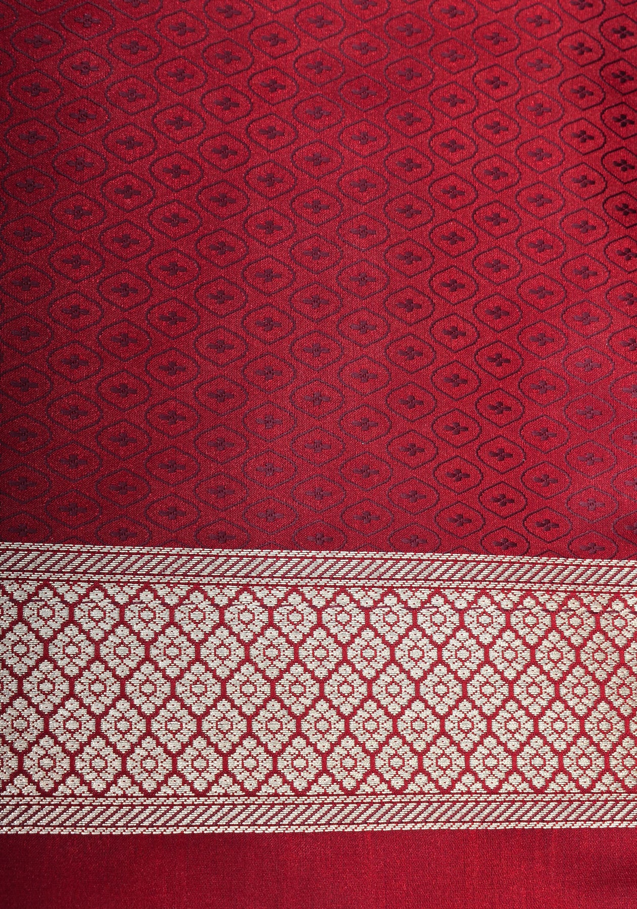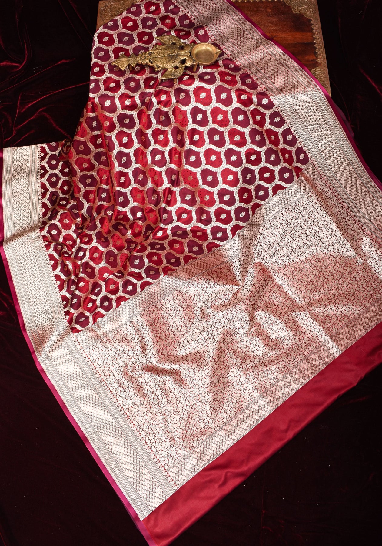 Indulge your playful streak with this Semi Silk Dark Red tone Saree! Featuring a dual tone meenakari Vintage Moroccan pattern , this saree embodies color, texture, and fluid lines. To top it off, the playful pink selvedges and zari border and pallu add an extra pop of color to this whimsical outfit.
