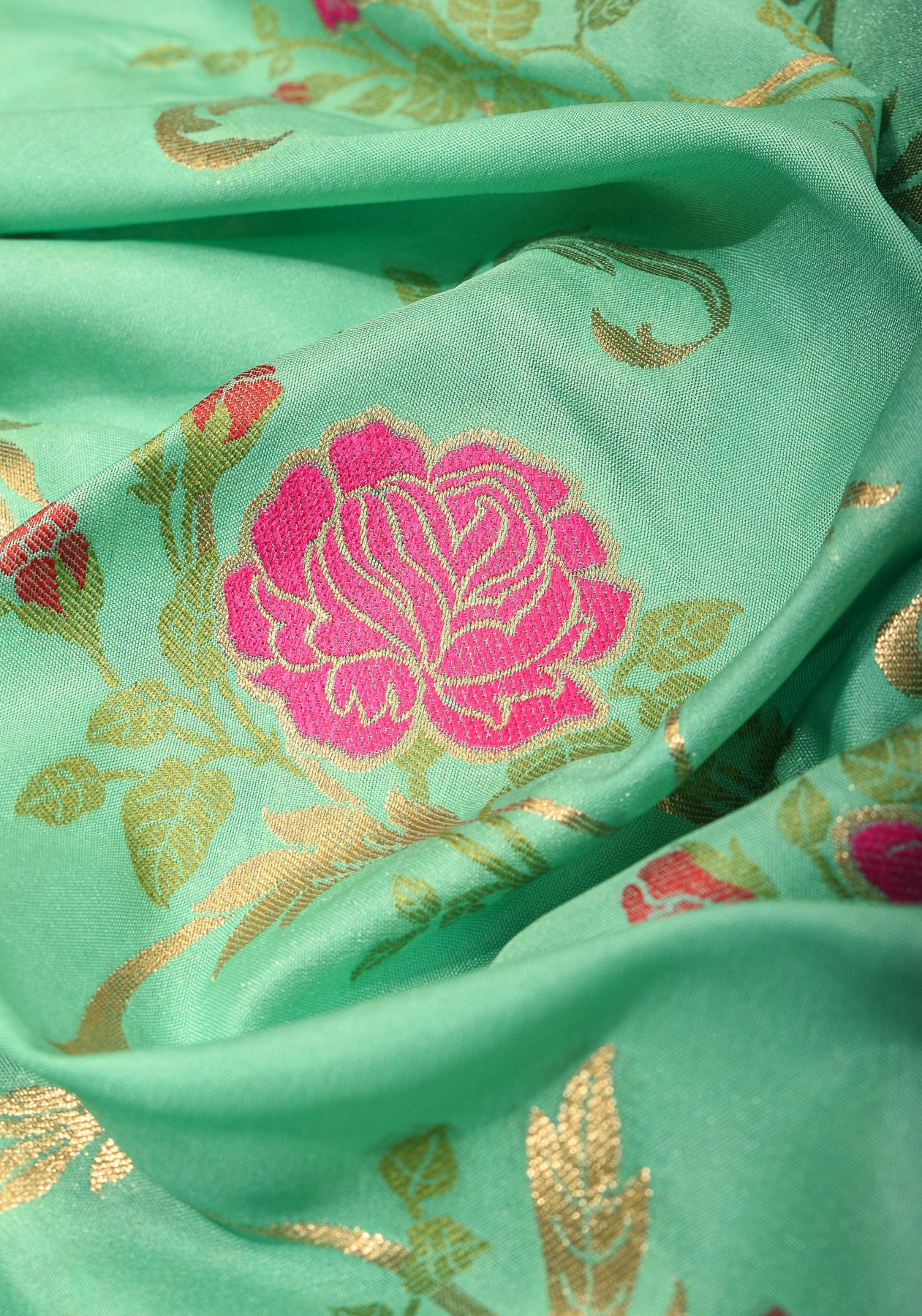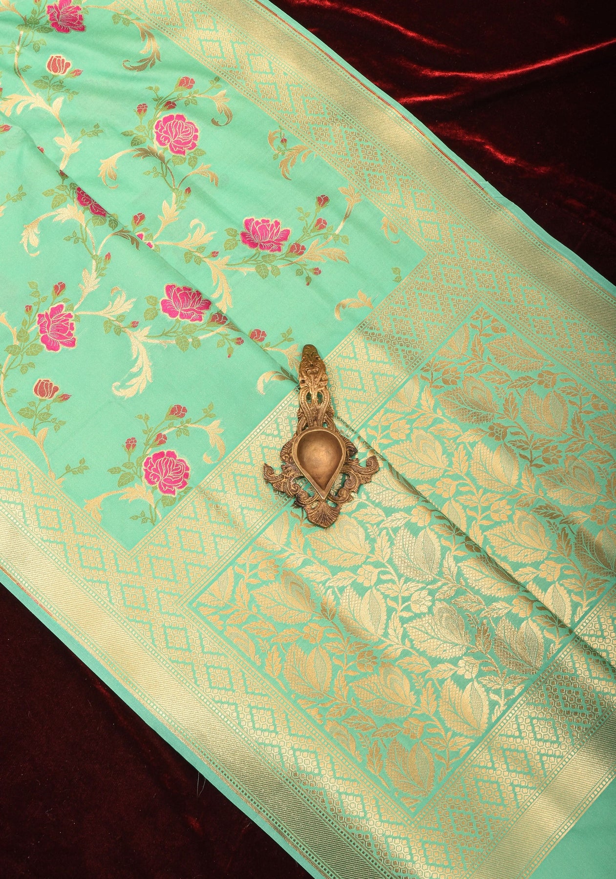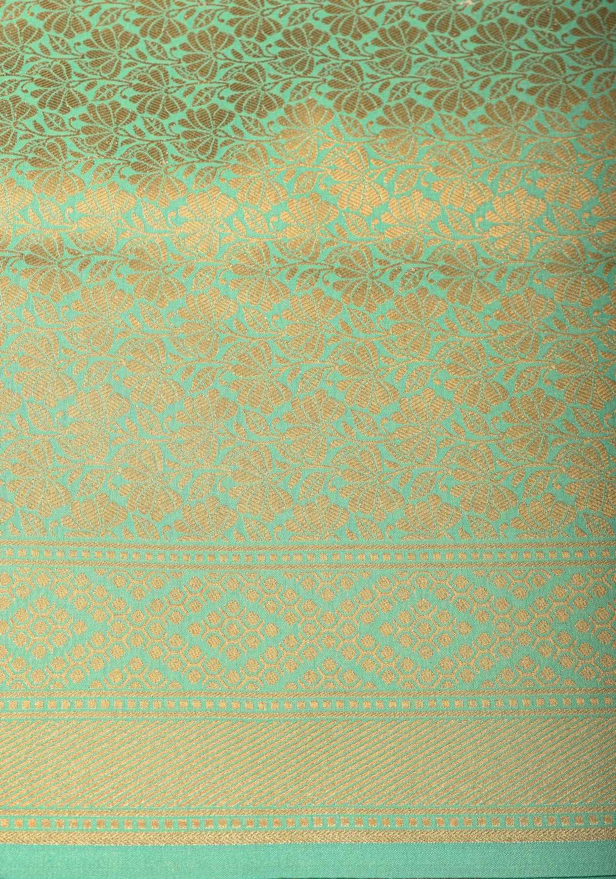 This aqua semi Silk saree is decorated with an elegant Floral jaal design with zari all over, giving it a rich and luxurious look. The florals are accented with Meenakari resham Border and pallu. When these stunning elements combine, it's a match made in heaven!