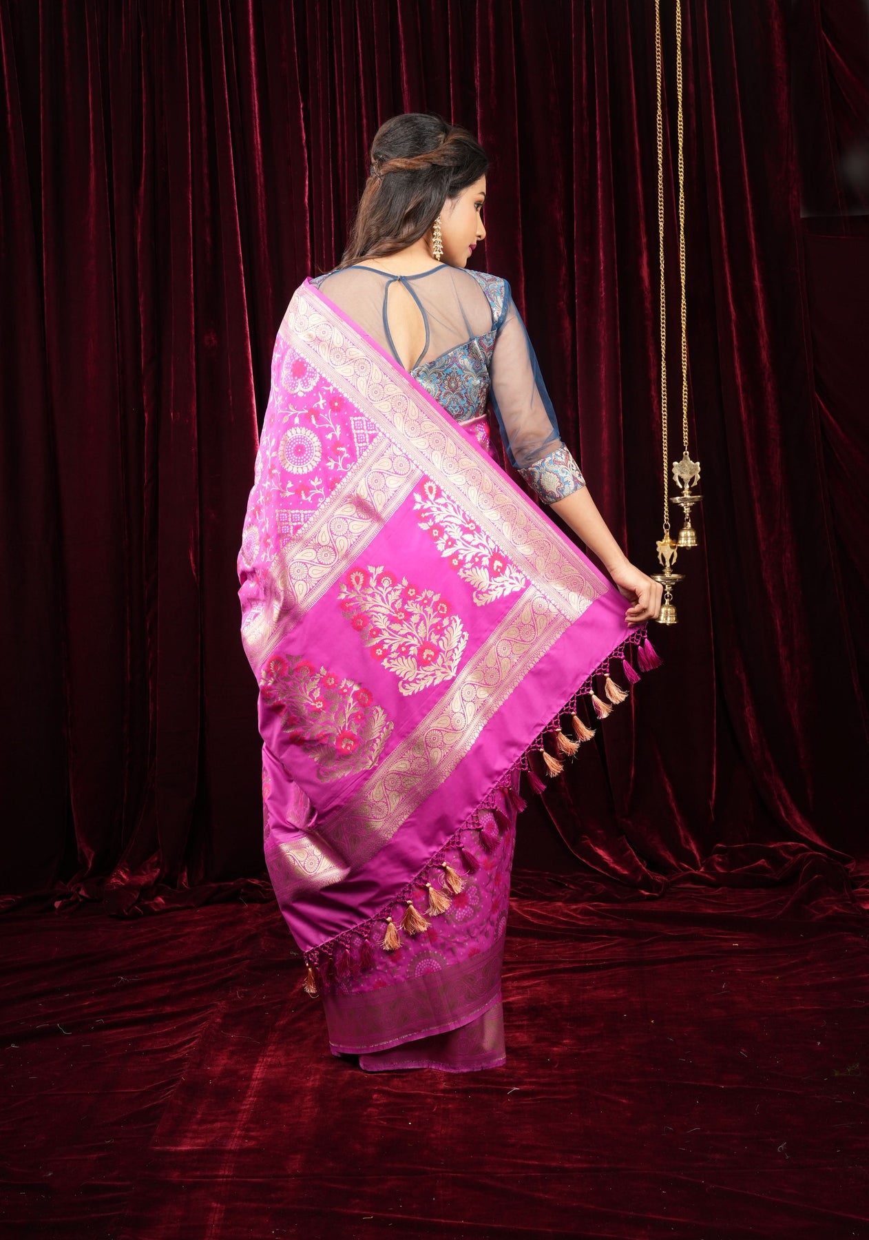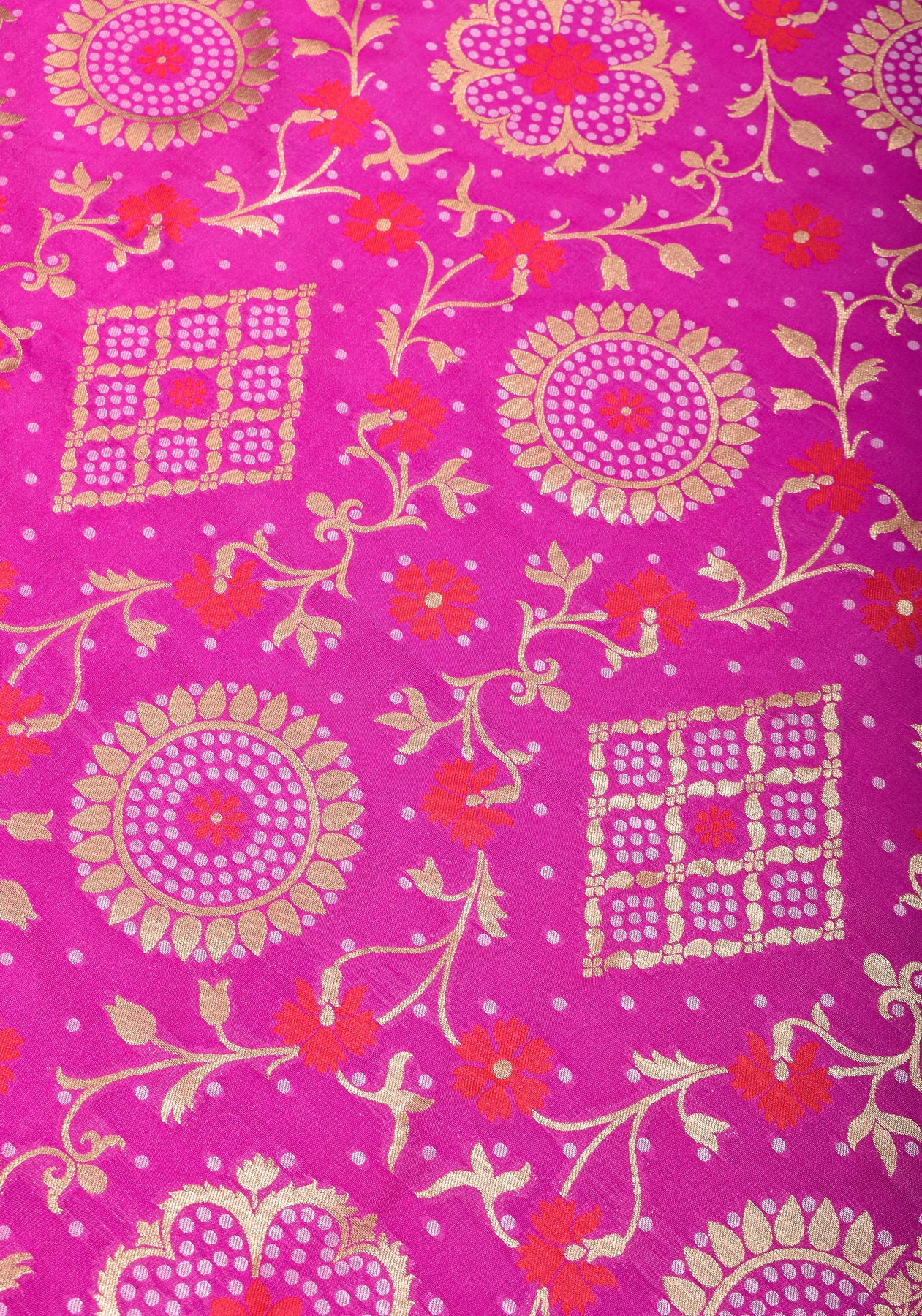 This Fuchsia semi Silk saree is decorated with an elegant Floral jaal design and Floral jaal Pattern meenakari in zari all over, giving it a rich and luxurious look. The florals are accented with Zari Border and pallu. When these stunning elements combine, it's a match made in heaven!