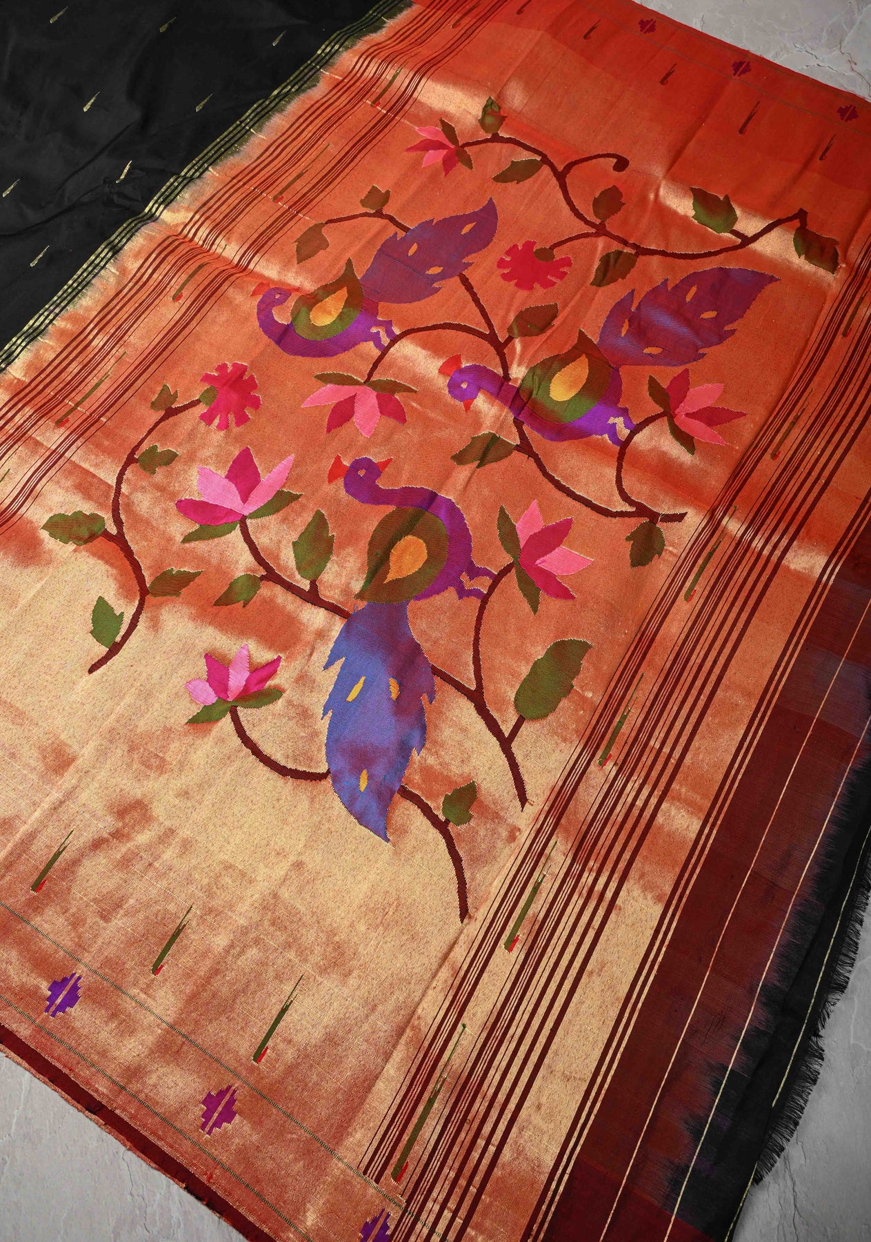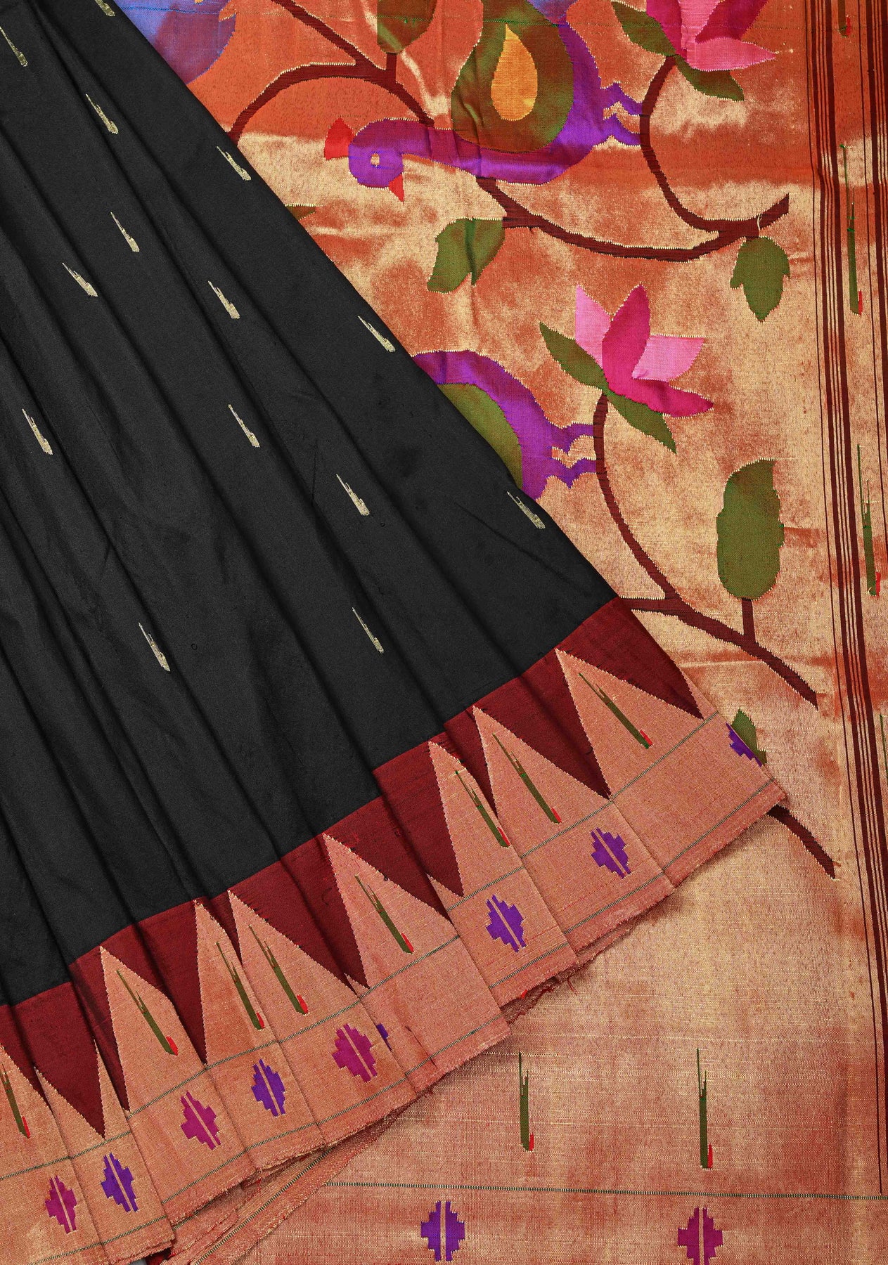 A symbol of heritage and timeless sophistication, this Authentic Black Yeola Paithani Handloom Silk Saree is a masterwork of traditional craftsmanship. Woven in the famed looms of Yeola, the saree features a deep, regal black base adorned with delicate golden zari buttas throughout the body, offering a subtle yet luxurious shimmer.