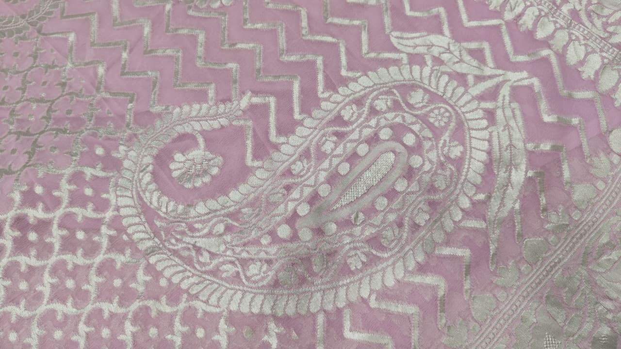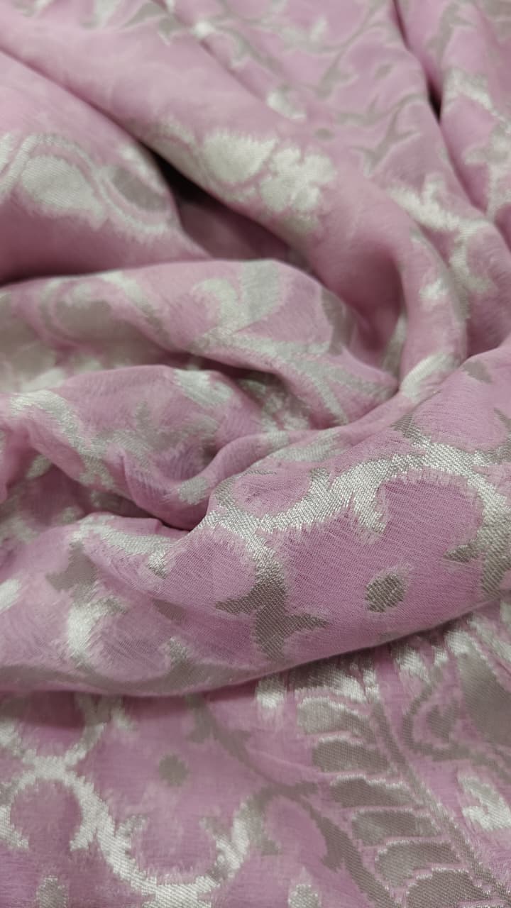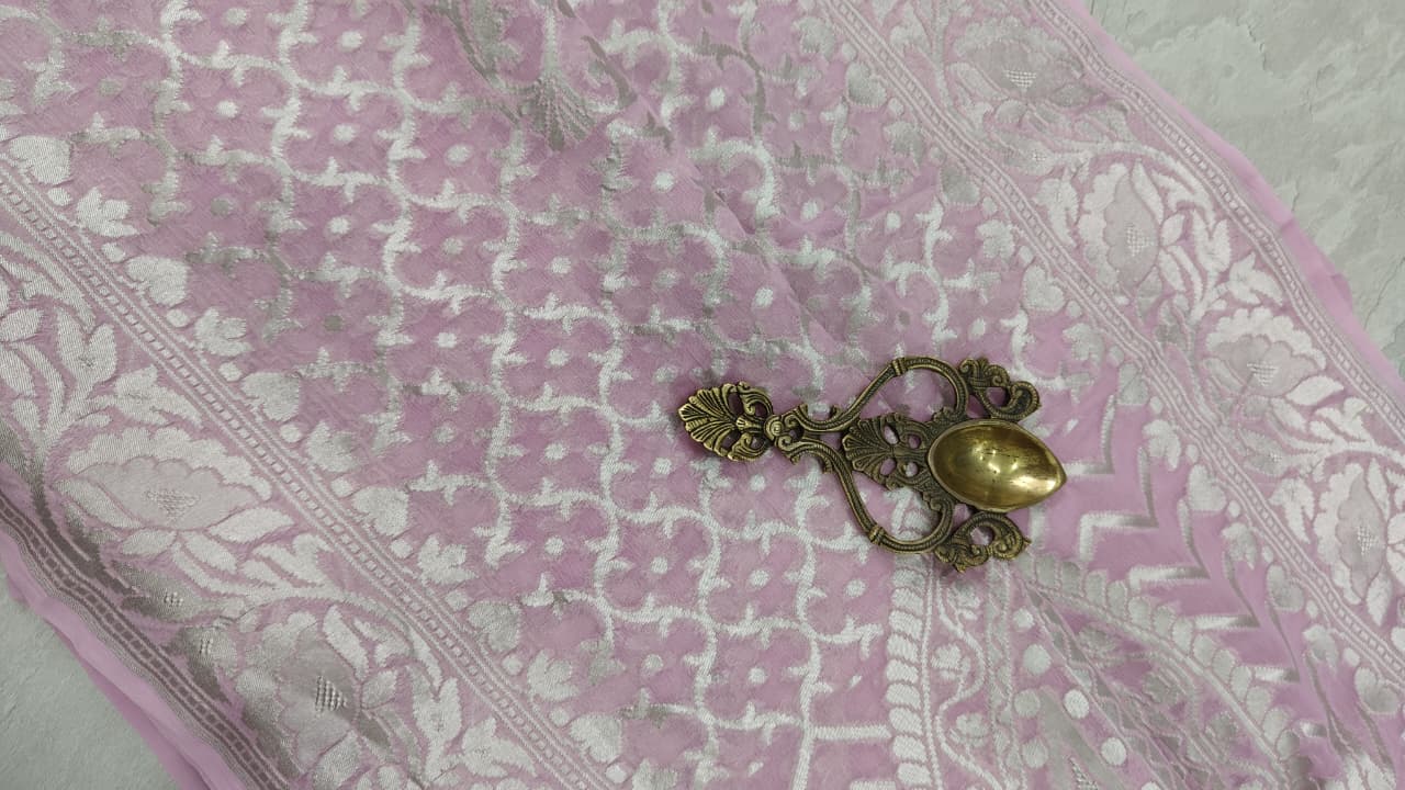 This Baby Pink Banarasi Georgette Silk Saree is a delicate blend of elegance and tradition. Crafted from soft georgette silk, it features an intricately woven trellis pattern that adds texture and sophistication to its graceful drape. The gentle baby pink hue exudes femininity and charm, while the finely detailed zari border lends a touch of classic Banarasi grandeur. Perfect for daytime functions, weddings, and festive gatherings, this saree offers a refined and graceful look for any special occasion.