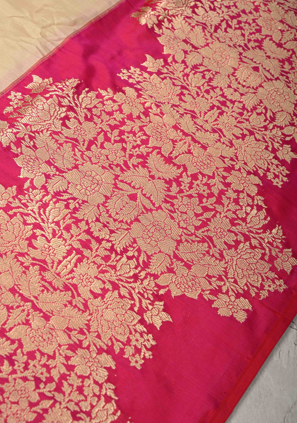 The subtle beige body is adorned with intricate floral zari buttas, delicately scattered across the fabric to add a refined sparkle. The standout feature is the contrast wide floral Kadhiyal zari border, richly woven with detailed floral motifs in shimmering gold zari—a hallmark of traditional Banarasi weaving that brings depth and opulence to the piece.
