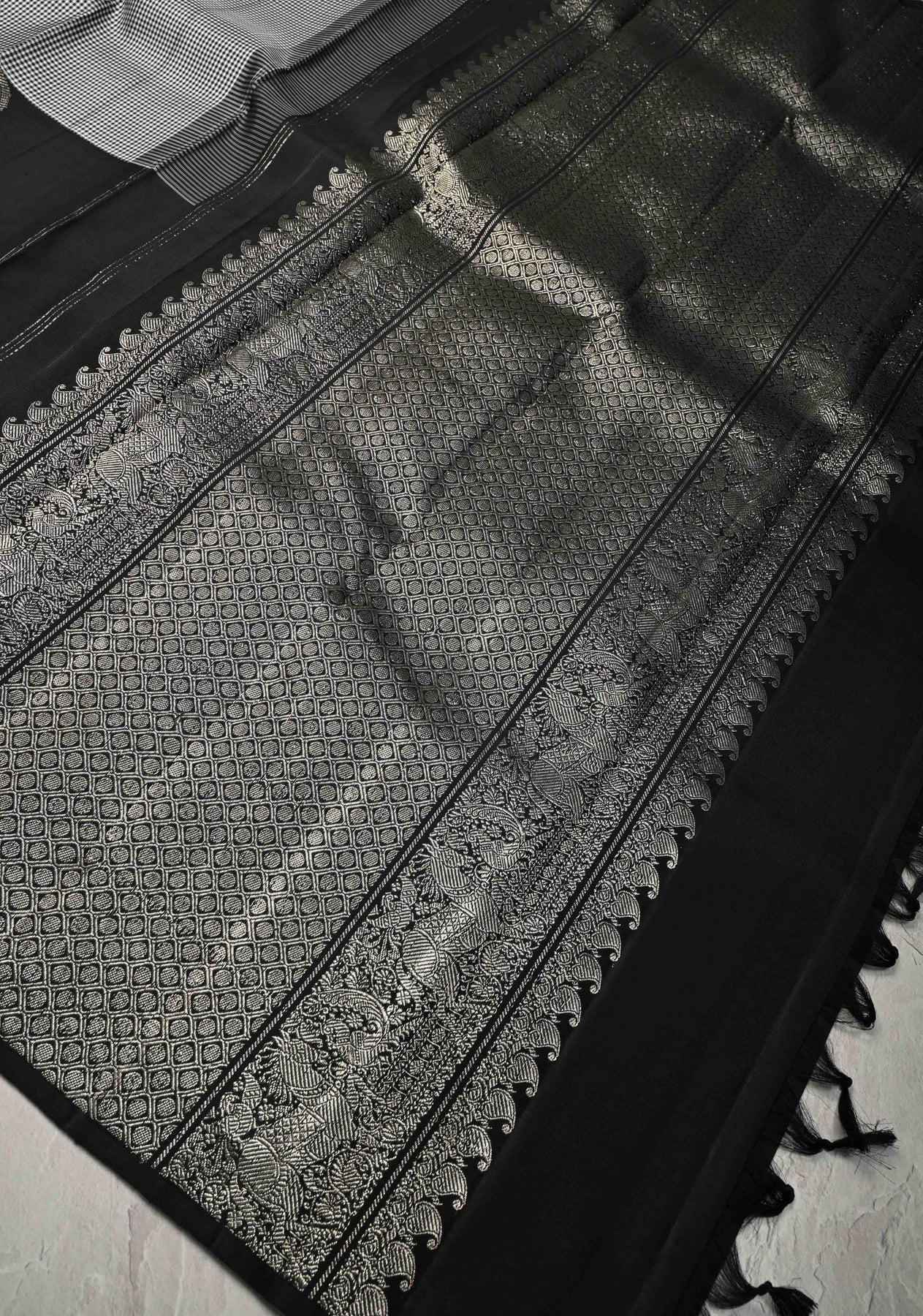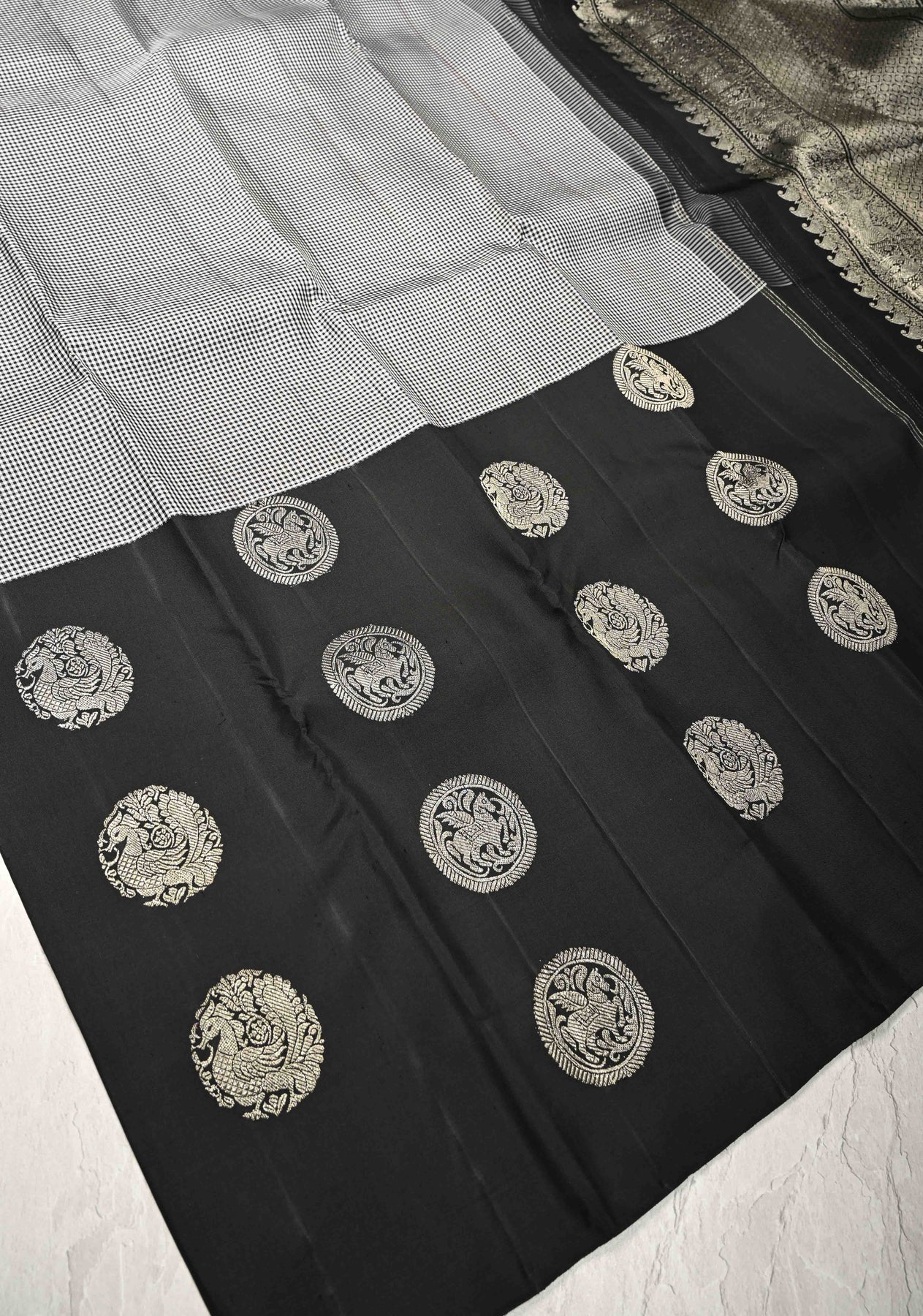 This striking Black-White Vintage Checks Kanjivaram Pure Silk Saree is a captivating blend of classic patterns and rich storytelling. Woven from pure silk, the saree features timeless black and white checks that add a vintage charm to its elegant body. The standout element is the intricately designed skirt border, adorned with detailed mythological motifs woven in zari, bringing traditional tales and cultural heritage to life. Perfect for festive occasions and cultural celebrations, this saree combines bold patterns with exquisite craftsmanship for a truly unique look.