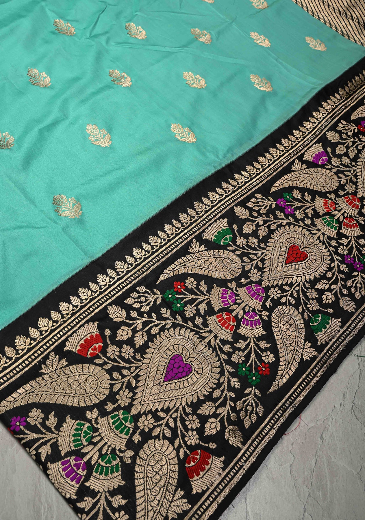 Cyan Green Pure Banarasi Katan Silk Saree with Floral Zari Buttas and Contrst  Meenakari Wide Border | SILK MARK CERTIFIED