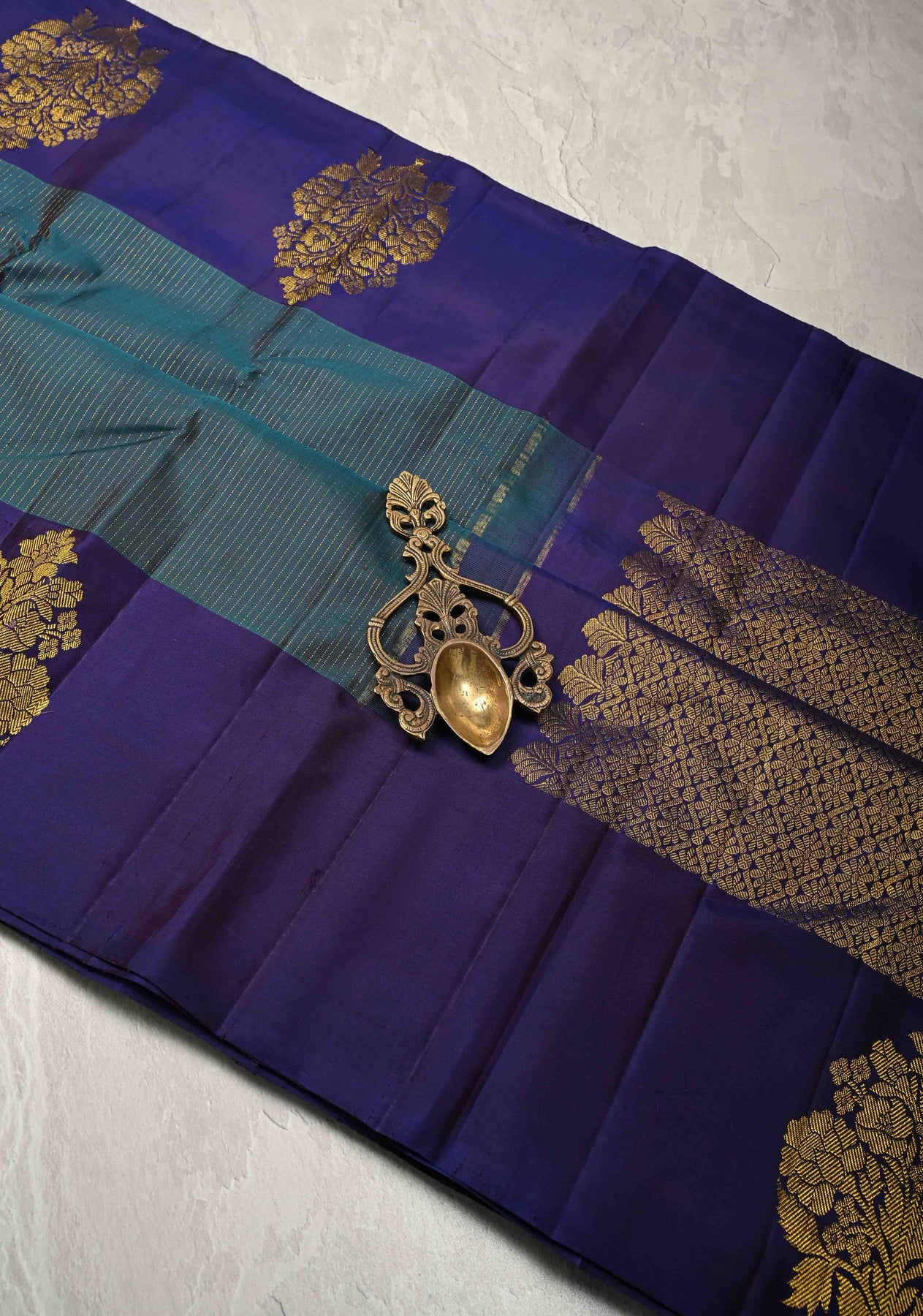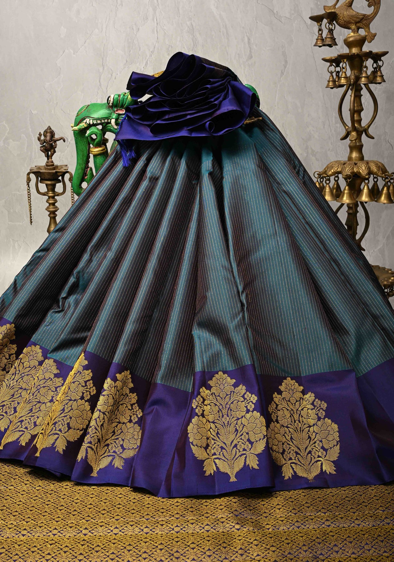 This Dark Teal Pure Kanjivaram Silk Handloom Saree is a graceful blend of tradition and artistry. The dark teal body is beautifully detailed with classic Vairaoosi zari stripes, adding depth and a radiant shimmer to the saree. The standout feature lies in the contrast zari border, adorned with distinct floral motifs that bring a touch of elegance and character to the ensemble. Handwoven from premium pure silk, the saree offers a luxurious drape and exquisite finish—perfect for weddings, festive occasions, and cultural celebrations.